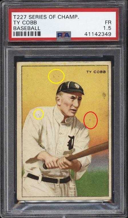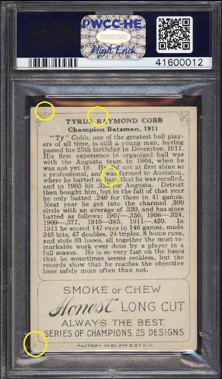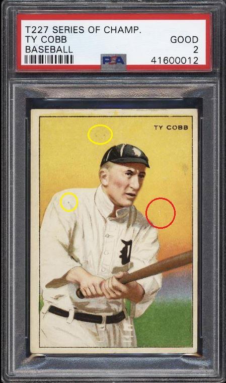 Note: From the PWCC PSA-2 description: "We have searched this card thoroughly and while we do locate a couple faint wrinkles or creases, we can't locate the rational behind what appears to be an overly conservative assessment." - No mention of the paper loss next to Cobb's belt...?