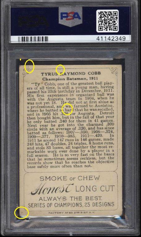 Note: From the PWCC PSA-1.5 description: "An exceedingly light crease to the lower right corner and minor paper loss near Cobb's belt affects the grade."