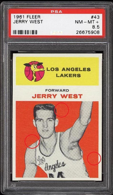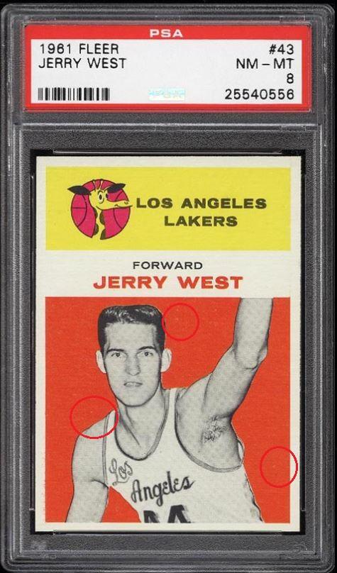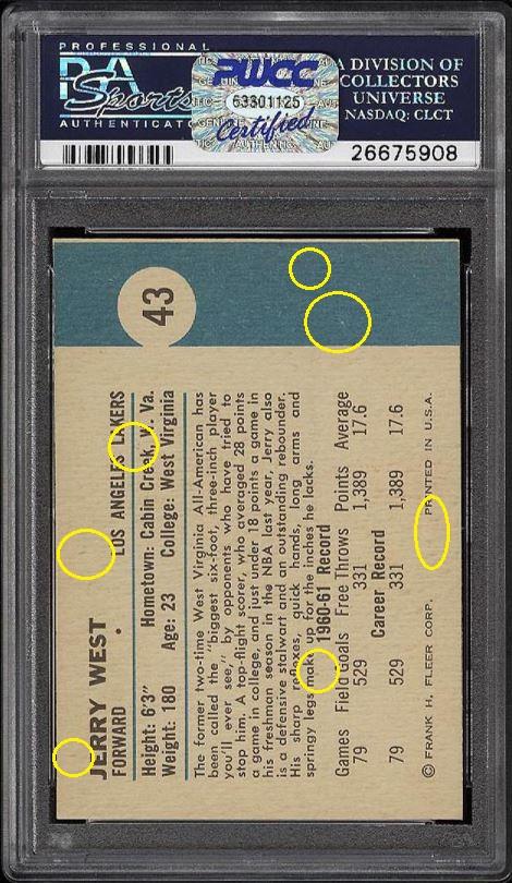 Red circles denote colored in spots. These spots were mentioned in the PSA-8 description. These are subtle touches that helped get a grade bump.