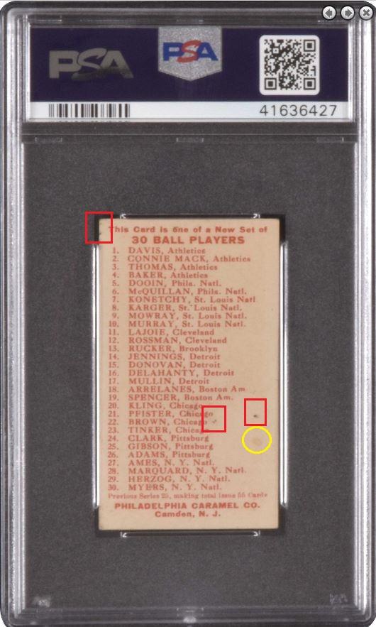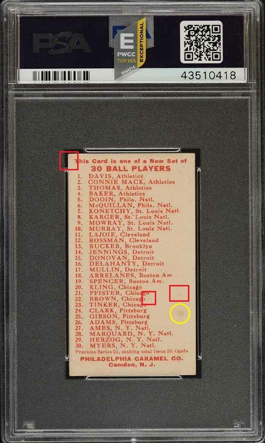 As with the E96 Lajoie, which Brent also "voluntarily" ended, I have no idea if he bought these cards from REA but I do know they are both altered, both had stickers and both are on PSA submissions that appear to have been made by him because he is selling or sold a number of cards from the PSA submissions.