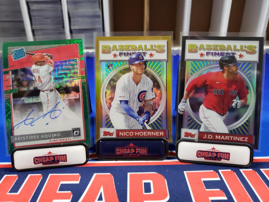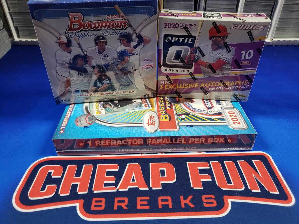 ALL Cards Ship! If you buy 10, I will get you into all 10 breaks. I cannot guarantee any spots otherwise. If you put "early breaks" but you are one of the last to pay, I can't move you up that far. I do my best. All 3 boxes you see are in each break. IF YOU WANT MULTIPLE SPOTS IN THE SAME BREAK (vs spread out to all 10), PUT THAT IN THE 2nd BOX! If you buy 10 spots, I can get you in all 10 breaks. If you buy 4 but want 2 each in 2 breaks, put "2 Breaks" in the special instructions. If you leave that spot blank, I will spread them out as best I can. $48.99 This break is scheduled for tonight. To use the button: 1. Add your username in the blank box provided. 2. Adjust quantity and click update. 3. Click the button. 4. Make sure your address is correct. 5. Pay. I can only ship to the address attached to your payment. 2020 Panini Optic Choice 2020 Bowman Sapphire 2020 Topps Finest Flashback