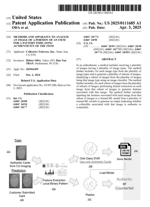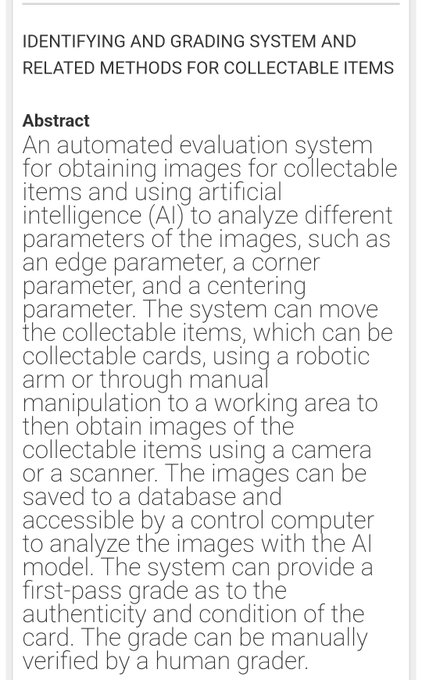 Not much has been publicly discussed, but PSA has been using some type of automated counterfeit detection since early last year. Not a huge surprise, but Nat even mentioned psa flagged several hundred cards that were already in circulation. This illustration could certainly explain how cards are getting damaged. robot arm crush! "The method can further include training a set of machine learning models based on the training set. Each machine learning model from the set of machine learning models can generate a grade for an image attribute from a set of image attributes. The set of image attributes can include an edge, a corner, a center, or a surface. The method can further include executing, after training, the set of machine learning models to generate a set of grades for an image of collectable not included in the training set." "The method further includes inputting the features associated with each image from that subset of images to a trained ML model from a plurality of trained ML models to generate an output indicating whether a collectible associated with that image is authentic or counterfeit."