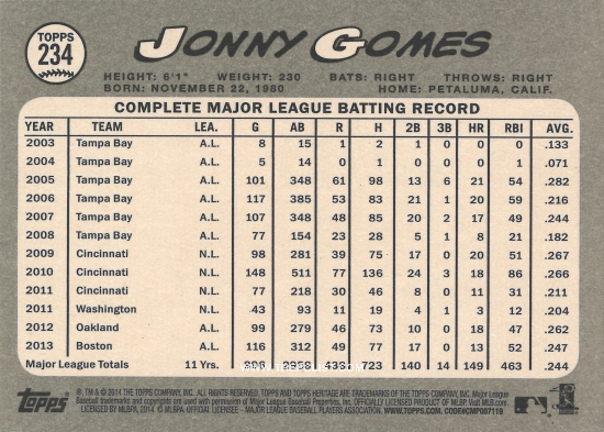 Back in 2015, a Topps Heritage collector working on the 2014 black backs and 2015 blue backs had hit the BIN on a Gomes blue back before I saw it. Reaching out to him a decade later, he was up to around 350/500 of the black backs, and an incredible 199/200 of the blue backs from 2015 High Numbers葉he missing card is the Lance McCullers rookie, hence the above note. It also turned out that he had the 2014 Gomes black back, which I had never seen. Assuming that the 2015 Gomes was untouchable, I asked if he might be open to parting with the 2014. In an extraordinary act of generosity, he simply asked for my address, and sent the cards my way葉hereby sacrificing his progress to help mine. (He didn't even ask for me to pay for shipping, let alone the cards.) Just like that, two of the last non-1/1s got knocked off my list: about as much progress as over the preceding decade. Including the two 2022 cards, this takes me to 588/597 (98.5%) of Gomes's non-1/1s; with 1/1s, the numbers are 725/904 (80.2%). I also know the location of one of the remaining non-1/1s葉he 2014 acetate /10謡hich is currently locked up with a team collector. 2014 Topps Heritage Black Back #274 ![]() ![]() 2015 Topps Heritage Blue Back #572 ![]() ![]() |