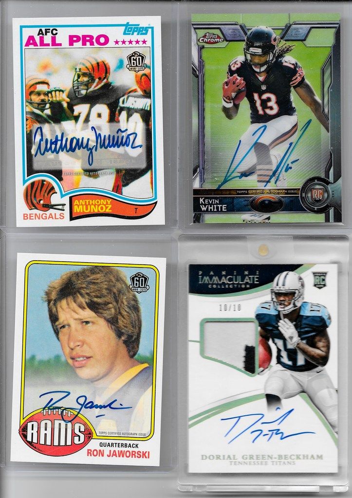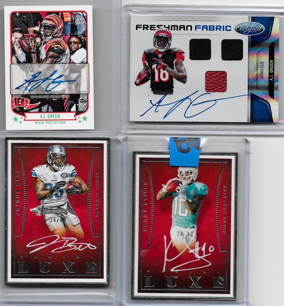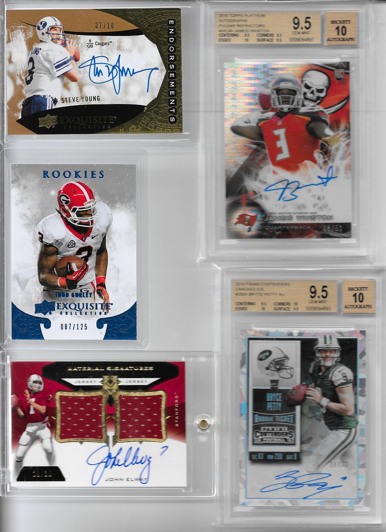 2013 Topps Magic AJ Green Mini Auto/10 2011 Certified Freshman Fabric Blue AJ Green RPA/50 2015 Luxe Joique Bell Framed Auto/49 2015 Luxe Kenny Stills Framed Auto/49 2014 Exquisite Endorsements Steve Young Auto/10 2013 Ultimate Material Signatures John Elway Jersey Auto/30 2014 Exquisite Todd Gurley XRC/125 2015 Topps Chrome Kevin White Base Auto SP 2015 Topps 60th Anniversary Anthony Munoz Auto 2015 Topps 60th Anniversary Ron Jaworski Auto 2015 Immaculate Dorial Green-Beckham RPA/10 2015 Topps Platinum Jameis Winston Pulsar Auto/50 BGS 9.5 with 10 Auto 2015 Contenders Bryce Petty Cracked Ice Auto/23 BGS 9.5 with 10 Auto(.5 from a Gem Mint 10) ![]() ![]()