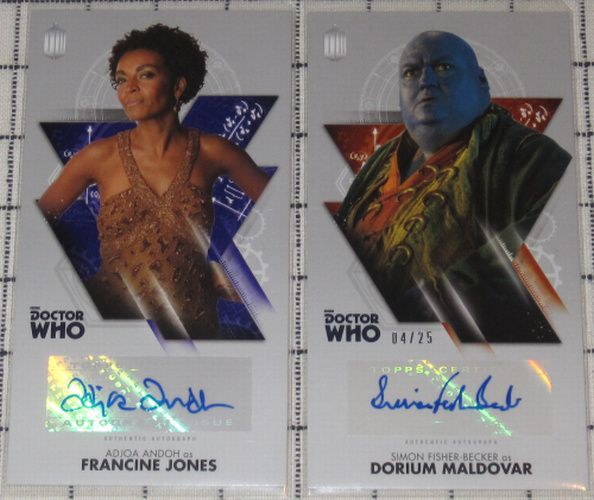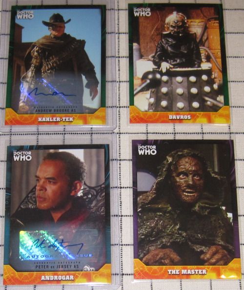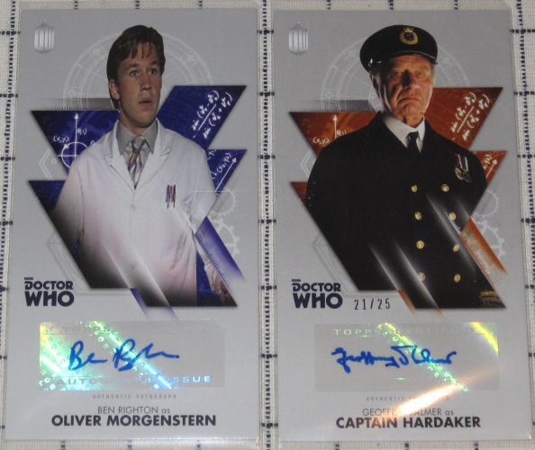 Doctor Who Signature Series box ![]() pack 1: Andrew Brooke as Kahler-Tek green auto /50, green parallel card /50 pack 2: Peter de Jersey as Androgar auto, purple parallel card /10 ![]() pack 3: Hannah Gordon as Kirsty McLaren yellow auto /25, green parallel card /50 pack 4: Ben Righton as Oliver Morgenstern auto Doctor Who 10th Doctor Widevision boxes x2 ![]() box 1: Adjoa Andoh as Francine Jones blue auto, Simon Fisher-Becker as Dorium Maldovar bronze auto /25 ![]() box 2: Ben Righton as Oliver Morgenstern blue auto, Geoffrey Palmer as Captain Hardaker bronze auto /25 Marvel Silver Age box ![]() TS88 dual archive cut with Iron Man and Captain America AC2 archive cut with The Hulk AC50 archive cut with Hercules ![]() parallel card /100, plus other insert cards |