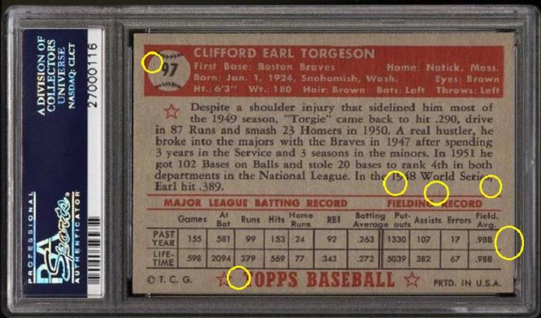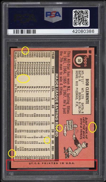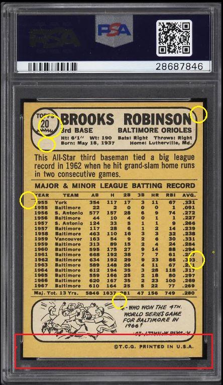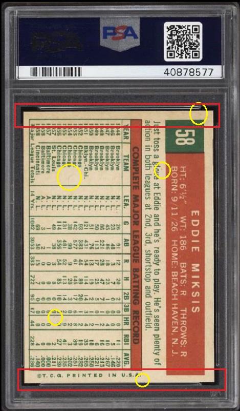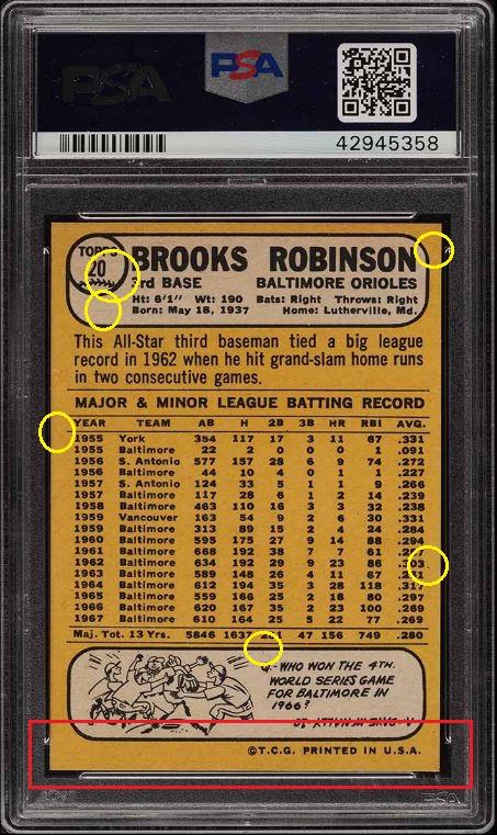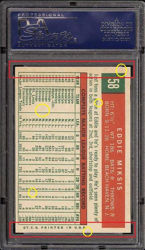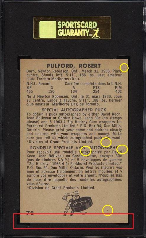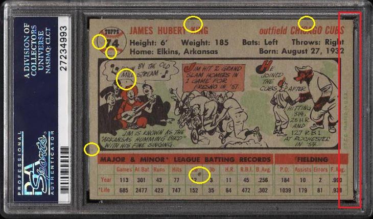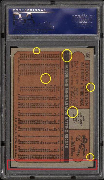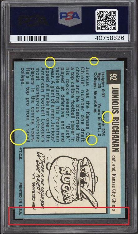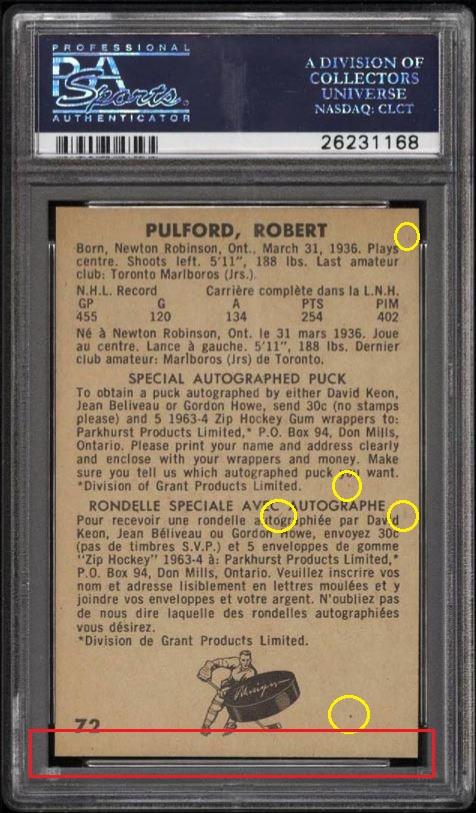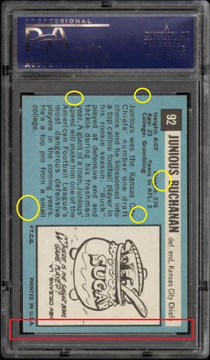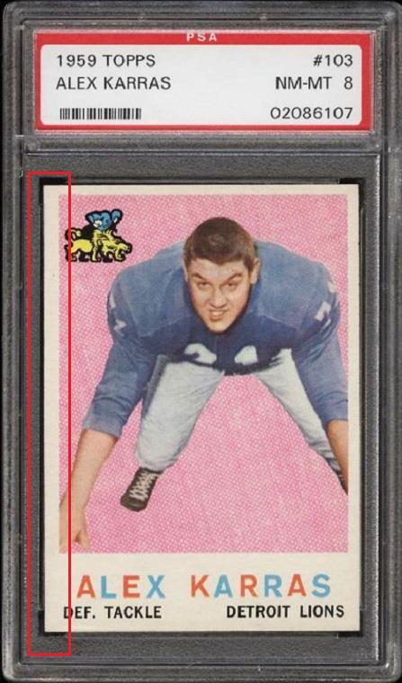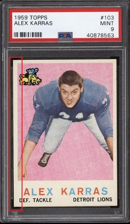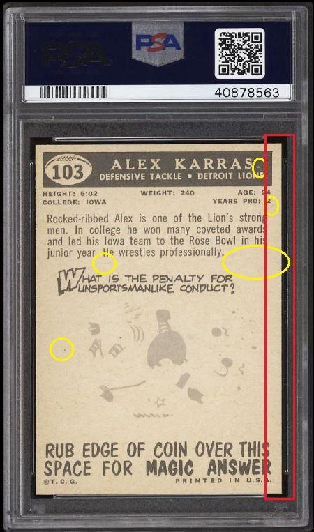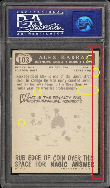 With that said, the rest of this thread is full of trimmed cards, shilling evidence, and at the end, a list of demands for COMC and PWCC as a result of the findings presented in this thread. V. Trimmed Modern Cards Sold Via PWCC First, the noted cards in each of the following threads originate from OCSI: 2001 Fleer Futures Pujols: https://www.blowoutforums.com/showthread.php?t=1304068 2011-12 Fleer Retro Leonard Auto: https://www.blowoutforums.com/showthread.php?t=1304114 James Harden #15: https://www.blowoutforums.com/showthread.php?t=1293843 Hockey cards: https://www.blowoutforums.com/showthread.php?t=1294469 1999 SP Signature Nolan Ryan: https://www.blowoutforums.com/showthread.php?t=1294466 Lebron RC Auto: https://www.blowoutforums.com/showthread.php?t=1294475 Next are the 18 cards that I identified from lists provided by ih8ca: https://www.worthpoint.com/worthoped...ect-1967540154 https://www.pwccmarketplace.com/items/1928372 Video overlay (thanks Mondo): ![]() https://www.worthpoint.com/worthoped...ght-1921412860 https://www.pwccmarketplace.com/items/1695735 ![]() https://www.worthpoint.com/worthoped...kie-1917463051 https://www.pwccmarketplace.com/items/1698044 ![]() https://www.worthpoint.com/worthoped...kie-1896668816 https://www.pwccmarketplace.com/items/1697859 ![]() https://www.worthpoint.com/worthoped...tat-1920928195 https://www.pwccmarketplace.com/items/1693699 ![]() https://www.worthpoint.com/worthoped...199-1915078054 https://www.pwccmarketplace.com/items/1698180 ![]() https://www.worthpoint.com/worthoped...uki-1913440107 https://www.pwccmarketplace.com/items/1692586 ![]() https://www.pwccmarketplace.com/items/1748775 https://www.pwccmarketplace.com/items/1519372 ![]() https://www.worthpoint.com/worthoped...end-1883536383 https://www.worthpoint.com/worthoped...-sp-1889957382 https://www.pwccmarketplace.com/items/1748766 ![]() https://www.worthpoint.com/worthoped...ble-1895686582 https://www.pwccmarketplace.com/items/1815371 ![]() https://www.pwccmarketplace.com/items/1433681 https://www.pwccmarketplace.com/items/1860711 ![]() https://www.worthpoint.com/worthoped...ium-1949537014 https://www.pwccmarketplace.com/items/1933511 ![]() https://www.worthpoint.com/worthoped...game-404845616 https://www.pwccmarketplace.com/items/1874729 ![]() https://www.worthpoint.com/worthoped...own-1955965681 https://www.pwccmarketplace.com/items/1892011 ![]() Included in this list of 18 cards are some from 2015. I originally started from 2015 moving onward, but due to picture quality, I shortly switched to going from newest to oldest sales. https://www.worthpoint.com/worthoped...xtra-461909339 https://www.worthpoint.com/worthoped...aded-823453279 https://www.worthpoint.com/worthoped...ded-1695855694 https://www.worthpoint.com/worthoped...o-rc-470633494 https://www.pwccmarketplace.com/items/1081766 https://www.worthpoint.com/worthoped...ght-1410743891 https://www.pwccmarketplace.com/items/1070036 https://www.worthpoint.com/worthoped...uto-1478411029 https://www.pwccmarketplace.com/items/1071409 ![]() Next are a random assortment of trimmed cards that I have found from card-buyer on PWCC but were not part of the original list of 18: https://www.pwccmarketplace.com/items/1464064 https://www.pwccmarketplace.com/items/1554608 ![]() https://www.pwccmarketplace.com/items/1545956 https://www.pwccmarketplace.com/items/1869527 ![]() https://www.worthpoint.com/worthoped...-rc-1949433015 https://www.pwccmarketplace.com/items/1897817 ![]() VI. Trimmed Vintage Sold via PWCC Thanks to corndog for all these. Again, this isn't even the tip of the iceberg. All cards were purchased by card-buyer. Some (noted below) do not appear in PWCC's sales history. Someone else can piece together why that is. Finally, most of these cards are so blatantly trimmed, it is comical that PSA missed them. PSA Cert #26231168 1963 Parkhurst Bob Pulford #72 - Population 1 of 7 Value gain of $252.99 This card was purchased by Ebay ID card-buyer from PWCC (Brent and Betsy Huigens) as a SGC 8.5 for $22.52 on April 27, 2016. PWCC Marketplace link: https://www.pwccmarketplace.com/items/1272213 Same card was sold by PWCC (Brent and Betsy Huigens) as a PSA 10 for $275.51 on March 26, 2017. PWCC Marketplace link: https://www.pwccmarketplace.com/items/1453129 Yellow circles are print, fiber, or chipping identifiers. Red square identifies trimmed bottom edge. ![]() ![]() ![]() ![]() ![]() ![]() PSA Cert #40758826 1964 Topps Buck Buchanan #92 Value gain of $491.11 This card was purchased by Ebay ID card-buyer from PWCC (Brent and Betsy Huigens) as a PSA 8 for $96.00 on November 22, 2017. PWCC Marketplace link: https://www.pwccmarketplace.com/items/1580246 Same card was sold by PWCC (Brent and Betsy Huigens) as a PSA 9 for $587.11 on July 22, 2018. PWCC Marketplace link: https://www.pwccmarketplace.com/items/1696862 Yellow circles are print, fiber, or chipping identifiers. Red square identifies trimmed bottom edge. ![]() ![]() ![]() ![]() ![]() ![]() PSA Cert #40878563 1959 Topps Alex Karras #103 Value gain of $291.12 This card was purchased by Ebay ID card-buyer from PWCC (Brent and Betsy Huigens) as a PSA 8 for $56.88 on November 22, 2017. PWCC Marketplace link: https://www.pwccmarketplace.com/items/1580038 Same card was sold by PWCC (Brent and Betsy Huigens) as a PSA 9 for $348.00 on July 22, 2018. PWCC Marketplace link: https://www.pwccmarketplace.com/items/1696528 Yellow circles are print, fiber, or chipping identifiers. Red square identifies trimmed left edge. ![]() ![]() ![]() ![]() PSA Cert #42945358 1968 Topps Brooks Robinson #20 Value gain of $92.50 This card was purchased by Ebay ID card-buyer from PWCC (Brent and Betsy Huigens) as a PSA 8 for $64.00 on September 13, 2018. PWCC Marketplace link: https://www.pwccmarketplace.com/items/1743542 Same card was sold by PWCC (Brent and Betsy Huigens) as a PSA 9 for $156.50 on April 14, 2019. PWCC Marketplace link: https://www.pwccmarketplace.com/items/1959715 Yellow circles are print, fiber,