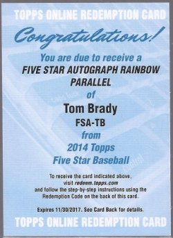 It's been 5 years sitting in my redemption queue. I've lost hope that it will get filled. He signed for the football product which came out AFTER but for whatever reason didn't sign this. I'd obviously rather have the card, but finally sent Topps an email last night asking what I could possibly get as replacement(s). The only comps I see are the 2014 Five Star Football autos that both sold north of $1000. What can I even expect in return? Since Topps hasn't had the football license in 5 years, they probably don't have any football replacements. Do I just go for Trout/Koufax type baseball guys? Can I ask them to get me a Brady auto from Panini?
