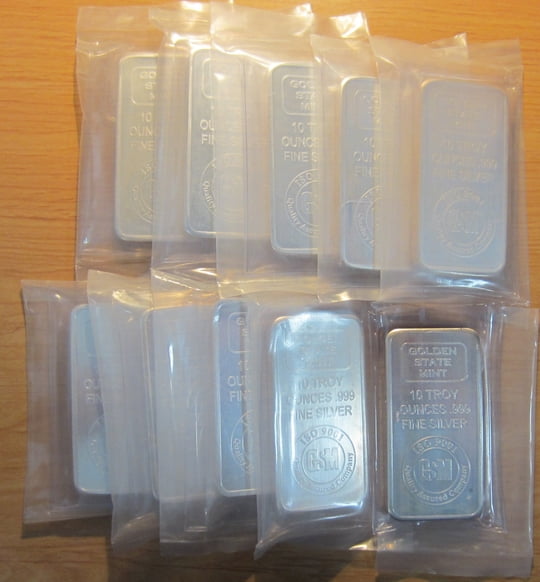 Have 10 - 10oz. Golden State Mint bars, all sealed in the original plastic. One is removed from a second outer plastic wrap, but the inner plastic is still fully intact. Sold as lots of 5 or all 10. Take 5 for , US only, delivered/insured/USPS sm.flat rate. Take all 10 for $OLD, US only, delivered/insured/USPS sm. flat rate. Price is firm. It's already EXTREMELY competitive, if not below every online dealer.