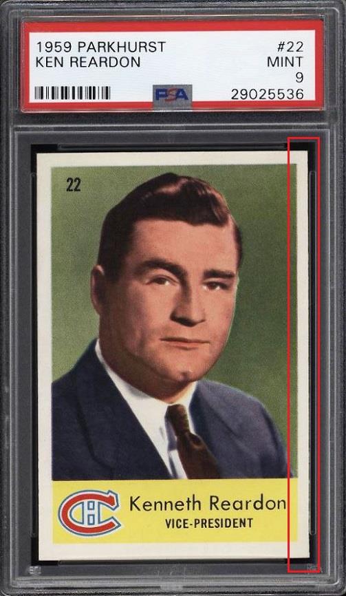 PSA Cert #29025536 1959 Parkhurst Ken Reardon #22 Value gain of $123.50 Set Registry: Private This card was purchased by masked Ebay ID e***c (irvinecardco) from Ebay seller highlandresale as a PSA 8.5 for $45.00 on December 02, 2017. Same card was sold by PWCC as a PSA 9 for $168.50 on June 24, 2018. Yellow circles are print, fiber, or chipping identifiers. Red box identifies trimmed right edge. ![]() ![]() ![]()