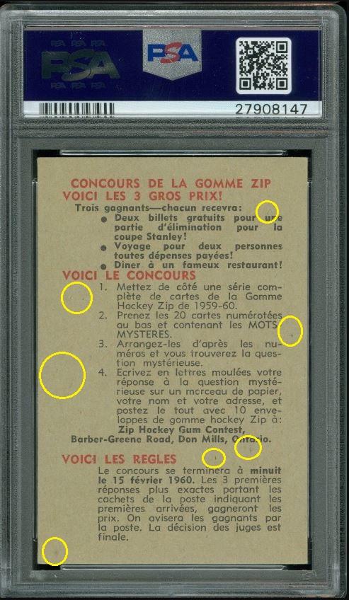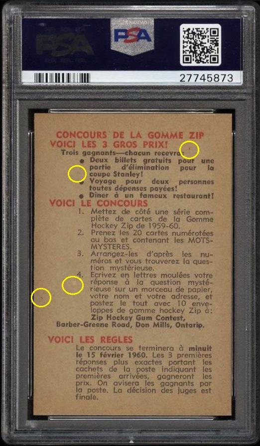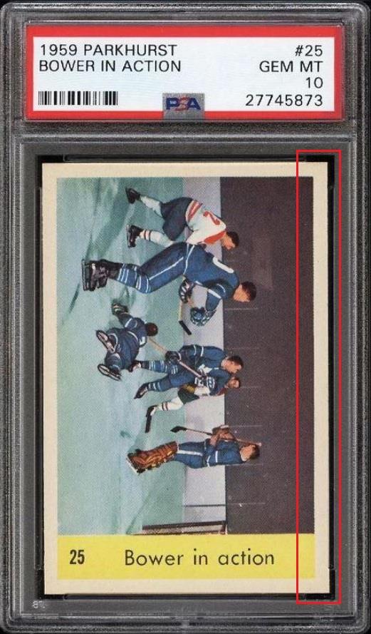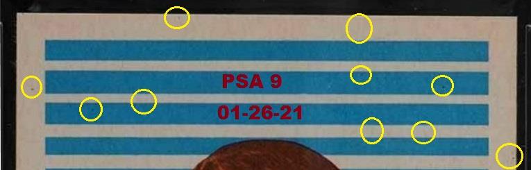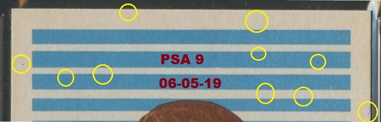 PSA Cert #27745873 1959 Parkhurst Bower in Action #25 Value gain of $2,876.90 Set Registry: Private This card was purchased by masked Ebay ID e***c (irvinecardco) from Ebay seller metropolis1961 as a PSA 8 for $73.09 on May 20, 2017. Same card was sold by Ebay seller PWCC as a PSA 10 for $2,949.99 on November 27, 2017. Yellow circles are print, fiber, or chipping identifiers. Red box identifies trimmed right edge (as viewed). ![]() ![]() ![]() ![]() ![]() ![]()
