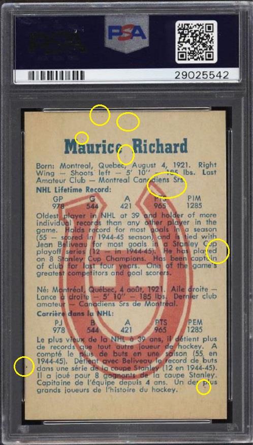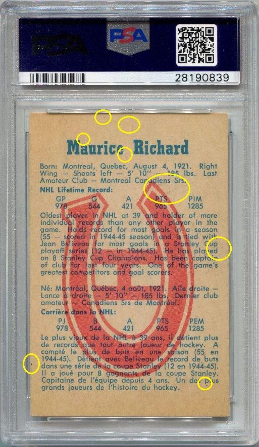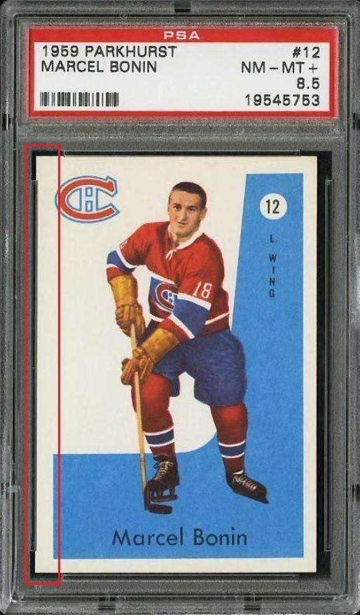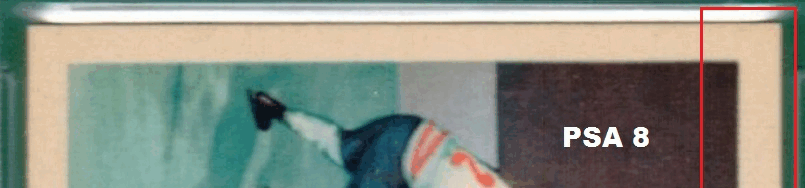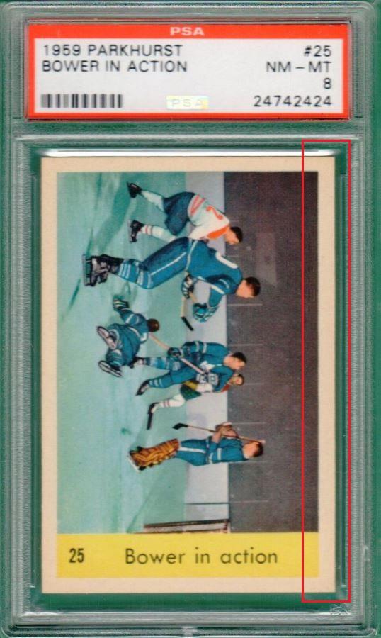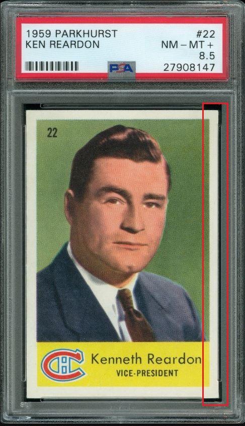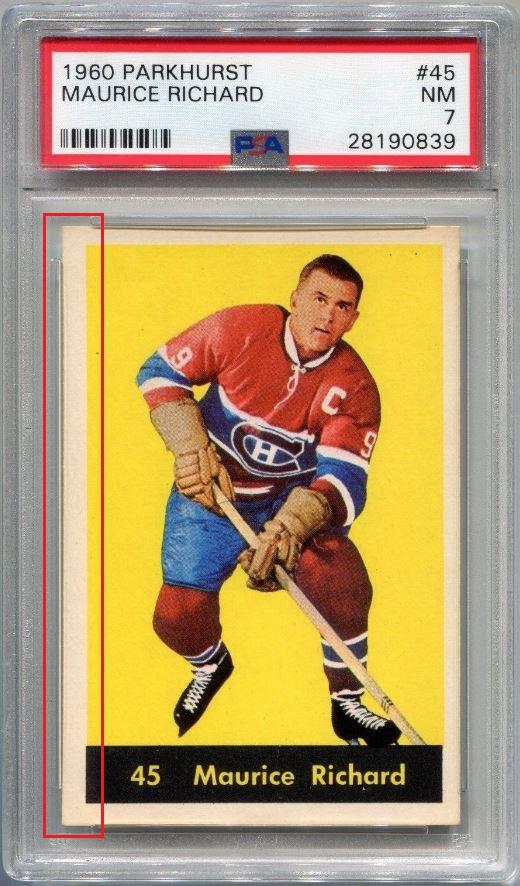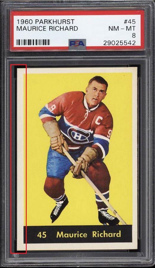 PSA Cert #29025538 1959 Parkhurst Maurice Richard #2 Value LOSS of $310.00, although the altered card has since sold for $1,400.00 in March, 2021: ![]() Set Registry: None found This card was purchased by masked Ebay ID e***c (irvinecardco) from Ebay seller can_collect as a PSA 8 for $960.00 on November 05, 2017. Same card was sold by PWCC as a PSA 8 for $650.00 on June 28, 2018. Yellow circles are print, fiber, or chipping identifiers. Red box identifies trimmed right edge. ![]() ![]() ![]() ![]() ![]()