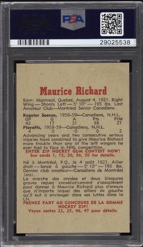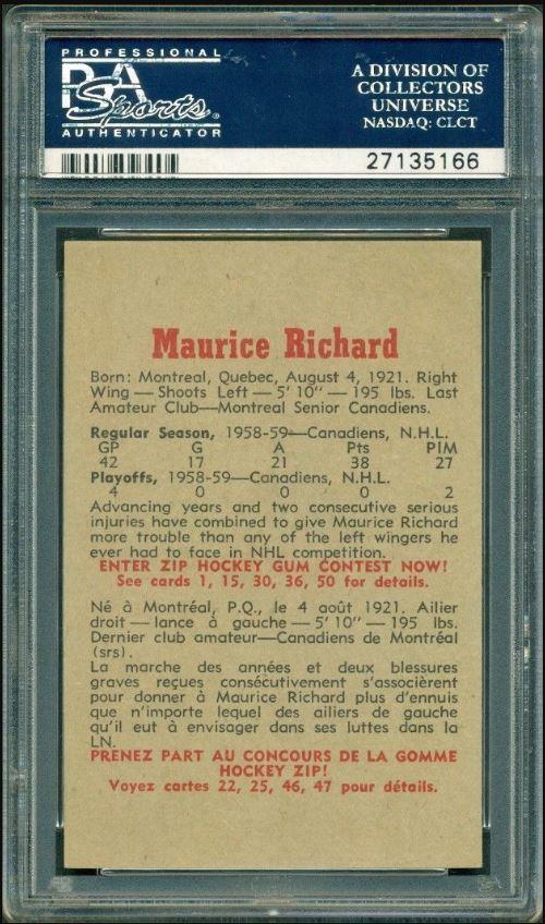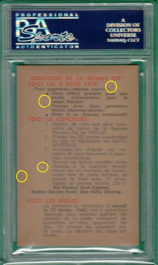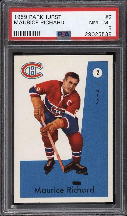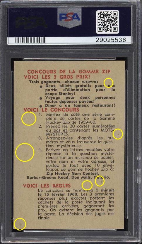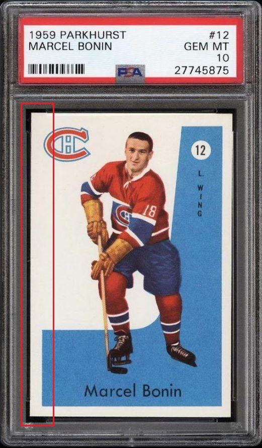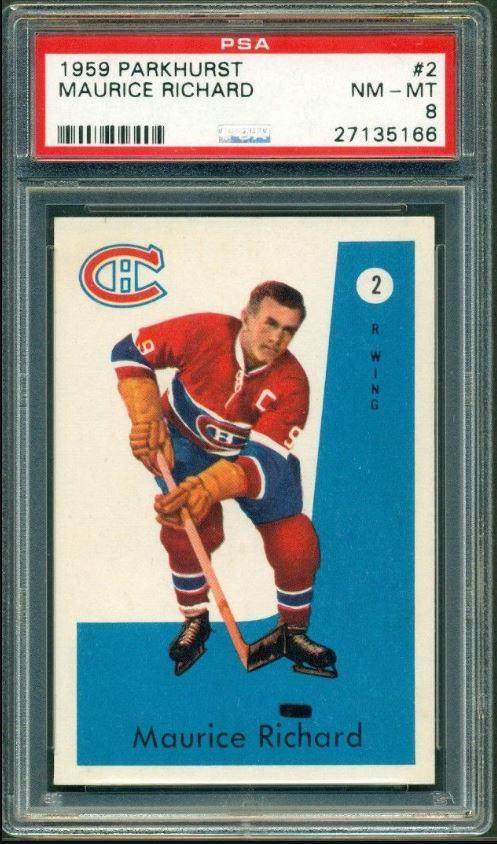 PSA Cert #29025538 1959 Parkhurst Maurice Richard #2 Value LOSS of $310.00, although the altered card has since sold for $1,400.00 in March, 2021: ![]() Set Registry: None found This card was purchased by masked Ebay ID e***c (irvinecardco) from Ebay seller can_collect as a PSA 8 for $960.00 on November 05, 2017. Same card was sold by PWCC as a PSA 8 for $650.00 on June 28, 2018. Yellow circles are print, fiber, or chipping identifiers. Red box identifies trimmed right edge. ![]() ![]() ![]() ![]() ![]()