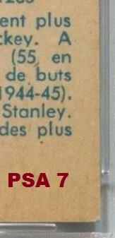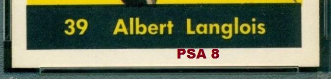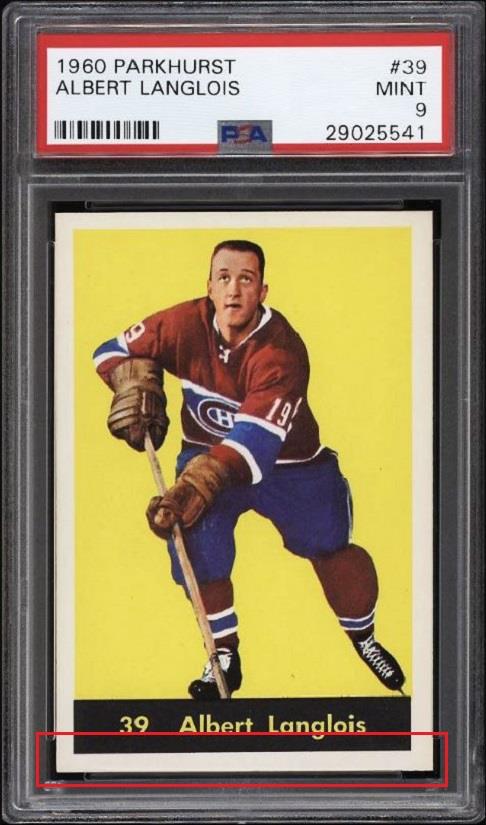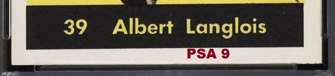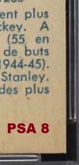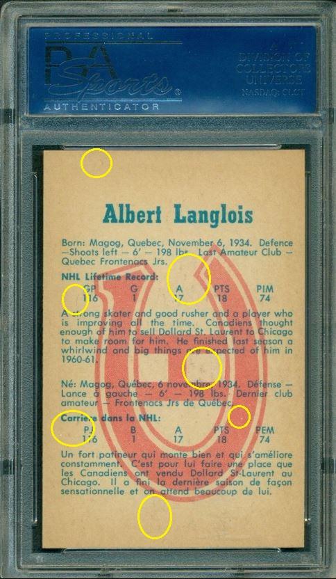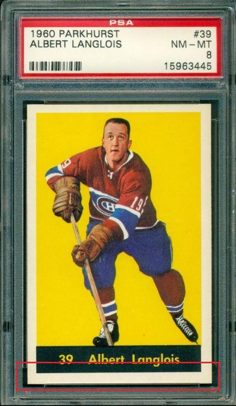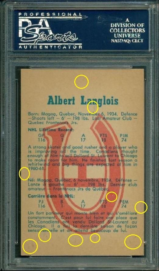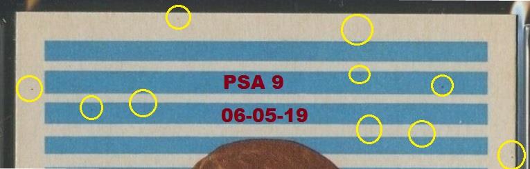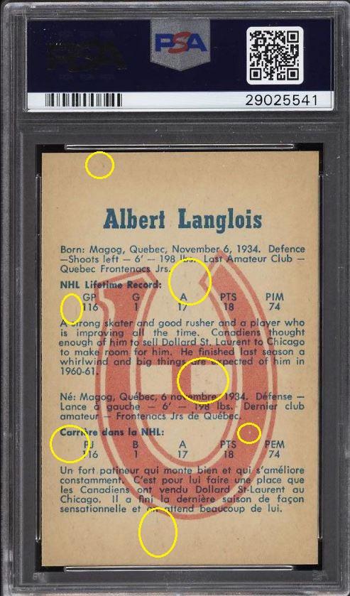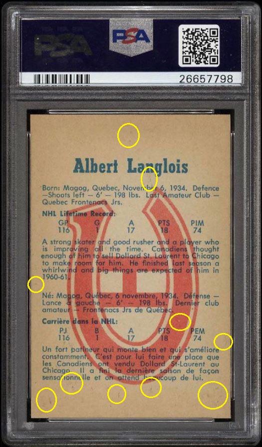 PSA Cert #29025541 1960 Parkhurst Albert Langlois #39 Value gain of $40.00 Set Registry: TGN 60-61 PARKIE PSA 8 This card was purchased by masked Ebay ID e***c (irvinecardco) from Ebay seller lindavintage as a PSA 8 for $50.00 on January 16, 2018. Same card was sold by PWCC as a PSA 9 for $90.00 on June 24, 2018. Yellow circles are print, fiber, or chipping identifiers. Red box identifies trimmed bottom edge. ![]() ![]() ![]() ![]() ![]()
