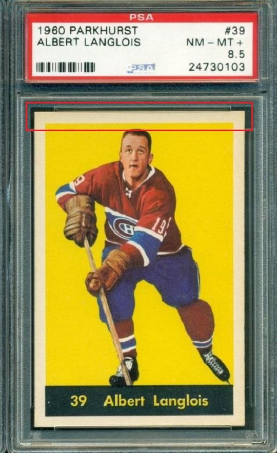 PSA Cert #26657798 1960 Parkhurst Albert Langlois #39 Value gain of $1,677.01 Set Registry: BigWes' 60 Parkies This card was purchased by masked Ebay ID e***c (irvinecardco) from Ebay seller can_collect as a PSA 8.5 for $64.99 on August 09, 2016. Same card was sold by PWCC as a PSA 10 for $1,742.00 on November 27, 2017. Yellow circles are print, fiber, or chipping identifiers. Red box identifies trimmed top edge. ![]() ![]() ![]() ![]() ![]() ![]()