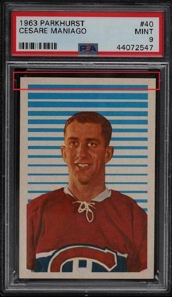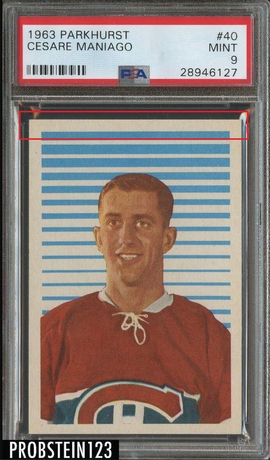 PSA Cert #44072547 1963 Parkhurst Cesare Maniago #40 Value gain of $6.51 Set Registry: None found This card was purchased by masked Ebay ID b***y (card-buyer) from Ebay seller probstein123 as a PSA 9 for $121.50 on June 05, 2019. Same card was sold by PWCC as a PSA 9 for $128.01 on January 26, 2021. Yellow circles are print, fiber, or chipping identifiers. Red box identifies trimmed top edge. No back image provided with the first sale. ![]() ![]() ![]() ![]()