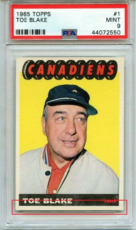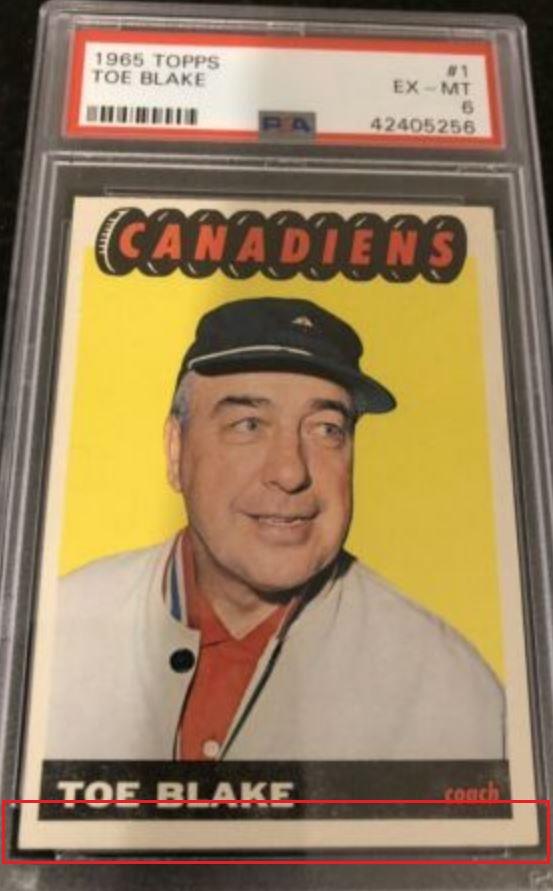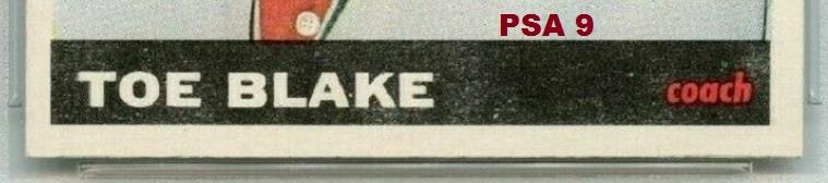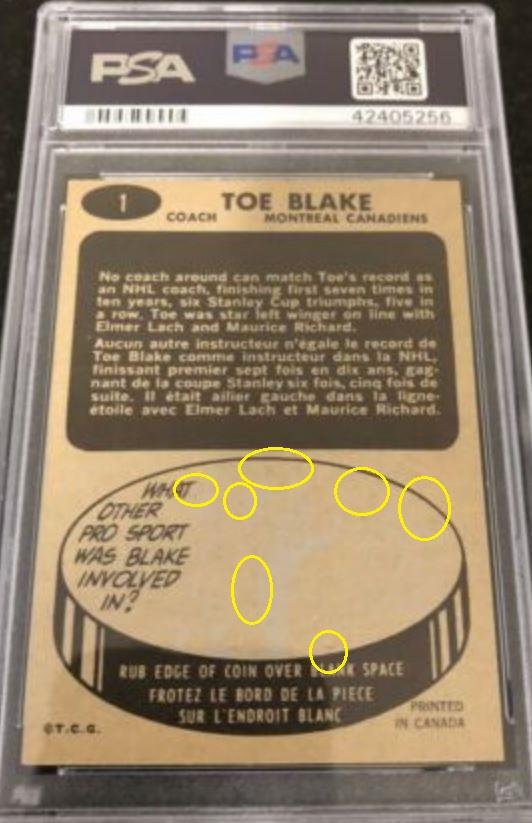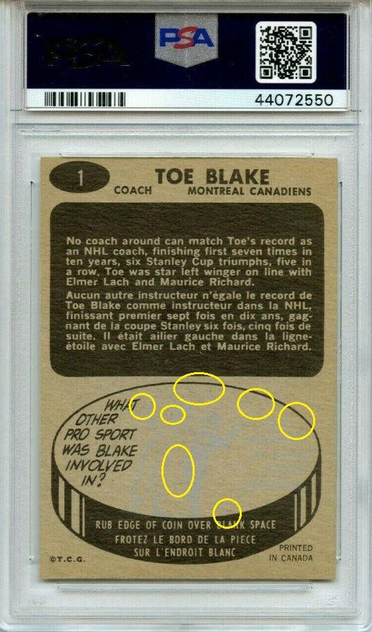PSA Cert #44072550 1965 Topps Toe Blake #1 Value gain of $775.00 Set Registry: None found This card was purchased by masked Ebay ID e***c (irvinecardco) from Ebay seller ssjjjjidsu as a PSA 6 for $55.00 on June 09, 2019. Same card was sold by Ebay seller julian691964 as a PSA 9 for $830.00 on December 27, 2020. Yellow circles are print, fiber, or chipping identifiers. Red box identifies trimmed bottom edge. ![]() ![]() ![]() ![]() ![]()