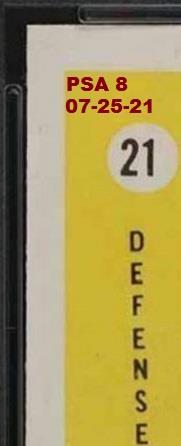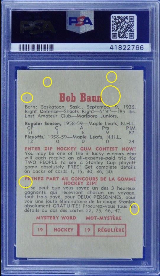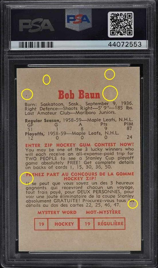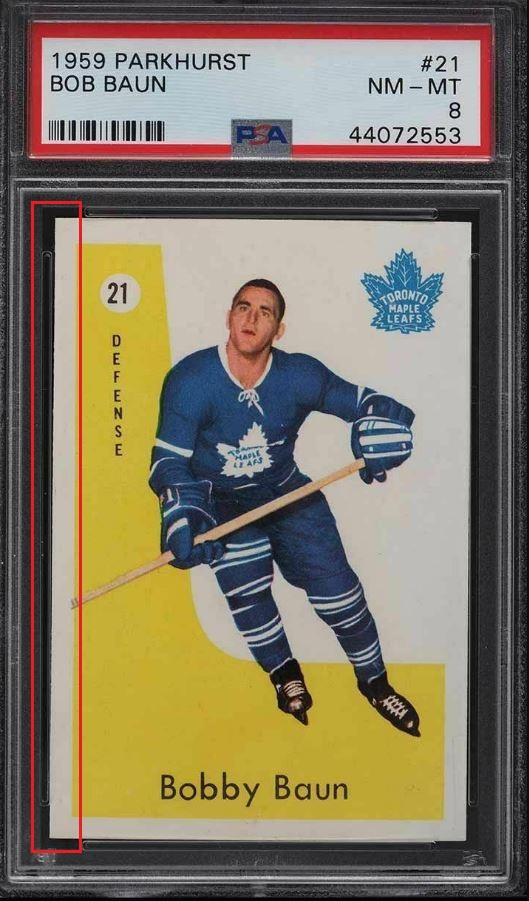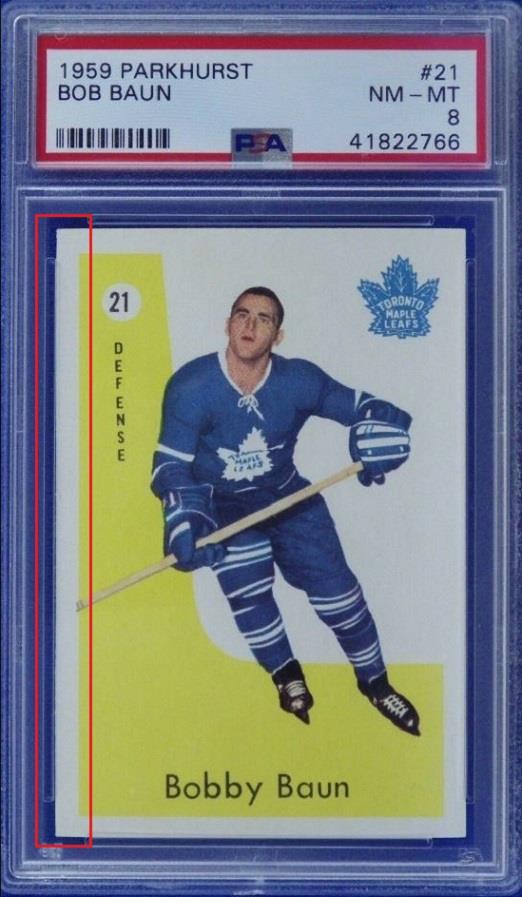 PSA Cert #44072553 1959 Parkhurst Bob Baun #21 Value gain of $3.91 Set Registry: ddhhpscpsa This card was purchased by masked Ebay ID e***c (irvinecardco) from Ebay seller mlbcanuck as a PSA 8 for $68.09 on June 23, 2019. Same card was sold by Ebay seller PWCC as a PSA 8 for $72.00 on July 25, 2021. Yellow circles are print, fiber, or chipping identifiers. Red box identifies trimmed left edge. ![]() ![]() ![]() ![]() ![]()