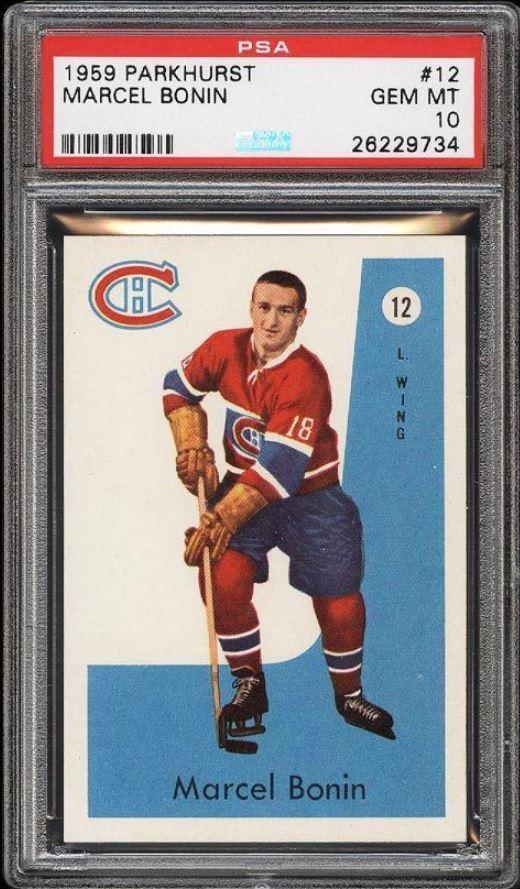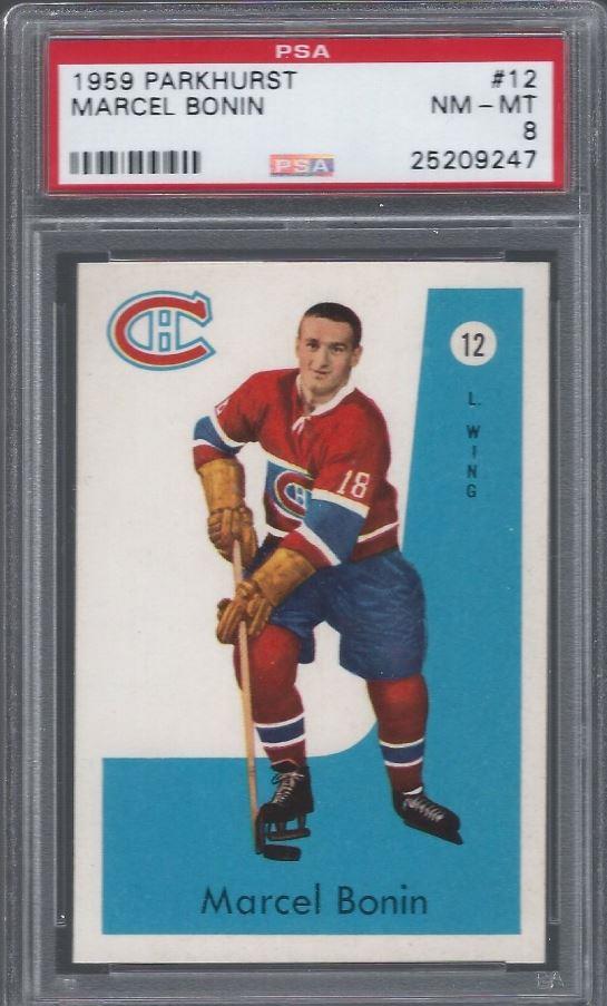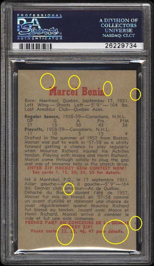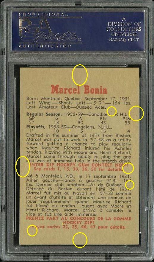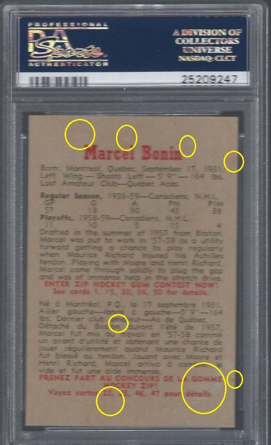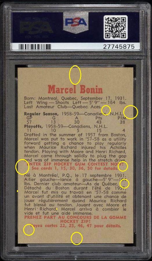 It went from an 8 to a 10 though. PSA 8 to PSA 10 The first of the Pop 2 cards graded a PSA 10 with both cards being attributed to The Rich Katz group of card doctors. ![]() PSA Cert #26229734 1959 Parkhurst Marcel Bonin #12 Value gain of $1,132.01 Set Registry: Private This card was purchased by masked Ebay ID b***y (card-buyer) from Ebay seller potts39 as a PSA 8 for $59.99 on April 22, 2016. Same card was sold by PWCC as a PSA 10 for $1,192.00 on December 18, 2016. Yellow circles are print, fiber, or chipping identifiers. I am unable to detect any alteration. ![]() ![]() ![]()