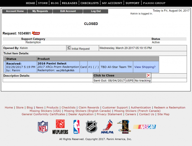 I got an email yesterday or the day before. "updated" but with no real update. Maybe as Panini reps were rolling from the Nationals they were busy catching up on Admin stuff. I got FedEx tracking numbers on items I already have in-hand. Whatevz