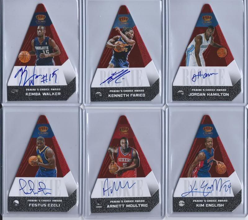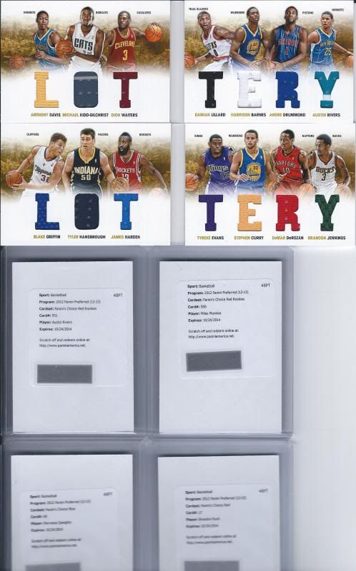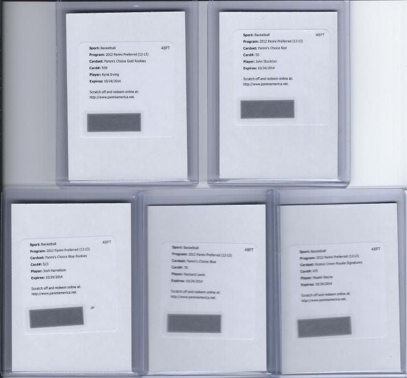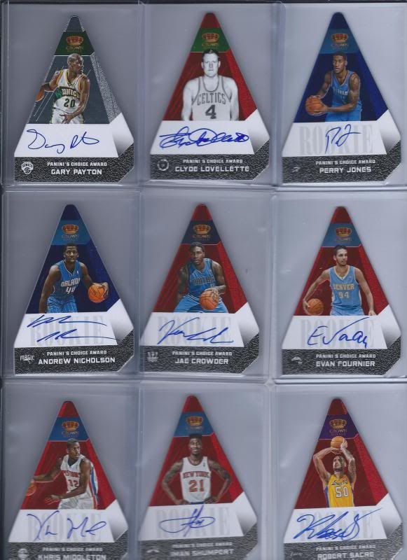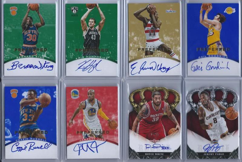 Case #1 1. d1234y2002 - Kyrie Irving Panini's Choice Gold Redemption Auto RC #/10 2. hester72598 - Taj Gibson Prime Silhouettes Auto Patch #17/25 3. spookowl1004 - John Stockton Panini's Choice Red Redemption Auto #/25 4. Rpetrovi - Gary Payton Panini's Choice Silver Auto #8/15 5. bma0215 - Nick Van Exel Silhouettes Auto Jersey #21/49 6. bgbdbstrd - AUTOPICK Rivals Booklet LeBron/Wade/Allen/Garnett/Pierce/Rondo #31/199 7. trigiv - AUTOPICK Steals Booklet LeBron/Granger/Smith/Conley/Paul/Iggy #158/199 8. dntuwsh (from got_watcha_want/from smurphy025) - Inducted Booklet Rodman/Parrish/Mullin/Drexler/DRob/Stockton/Malone/Pippen #73/99 9. cygtr - Jimmer Fredette Crown Royale Gold Auto RC #20/25 10. dntuwsh - Inducted Booklet Rodman/Parrish/Mullin/Drexler/DRob/Stockton/Malone/Pippen #17/99 11. mvessicchio - Clutch Booklet Kobe/Rondo/Billups/Lawson/Paul/Curry #197/199 12. bgbdbstrd - AUTOPICK Norris Cole Silhouettes Auto Jersey RC #44/99 13. magic10 - Rookie Booklet Leonard/Parsons/Williams/Barnes/Faried/Kidd-Gilchrist #31/249 14. mvessicchio (from sesmarine04) - Veteran Booklet Rose/Parker/Prince/Garnett/Gasol/Wade/Duncan #159/199 15. dntuwsh (from LuckySlayer) - Perry Jones Panini's Choice Blue Auto RC #4/49 16. hester72598 (from 23bulls2014) - Tayshaun Prince Silhouettes Auto Jersey #12/49 17. bma0215 - AUTOPICK Tony Wroten Silhouettes Auto Jersey RC #48/99 18. noddy - AUTOPICK Clyde Lovellette Panini's Choice Red #23/25 19. dntuwsh (from got_watcha_want) -AUTOPICK Iman Shumpert Panini's Choice Red RC #52/99 20. Lothar - PM PICK Matchup Booklet Horford/Gasol/Lopez/Lee/Boozer/Duncan/Cousins #113/199 21. Rpetrovi - Mark Aguirre Preferred Blue Auto #32/35 22. bma0215 - Detlef Schremph Preferred Red Auto #53/74 23. hester72598 (from 23bulls2014) - Knicks Booklet Kidd/Carmelo/Camby/Amare/Cartwright/Ewing #84/199 24. mvessicchio (from sesmarine04) - Knicks Booklet Kidd/Carmelo/Camby/Amare/Cartwright/Ewing #31/199 25. noddy - Evan Fournier Panini's Choice Red Auto RC #12/99 26. hester72598 (from 23bulls2014) - Lavoy Allen Silhouettes Auto Jersey RC #75/99 27. dntuwsh (from LuckySlayer) - Rashard Lewis Panini's Choice Blue Auto Redemption #/49 28. trigiv - AUTOPICK Andrew Nicholson Panini's Choice Blue Auto RC #14/49 29. cygtr - Bob Dandridge Preferred Auto #60/74 30. trigiv - AUTOPICK Kris Middleton Crown Royale Auto RC #19/99 31. Zacy87 - AUTOPICK Kris Middleton Panini's Choice Red Auto RC #70/99 32. Zacy87 - AUTOPICK Jae Crowder Panini's Choice Red Auto RC #5/99 33. burrguana - AUTOPICK Robert Sacre Panini's Choice Red Auto RC #45/99 34. statguy1.1 - AUTOPICK E'Twaun Moore Crown Royale Auto RC #60/99 35. bma0215 - PM LIST Luc Mbah A Moute Preferred Auto #12/74 36. cygtr - AUTOPICK Josh Harrellson Panini's Choice Blue Auto RC Redemption #/49 37. mvessicchio (from tamukiks) - Jamaal Tinsley Preferred Auto #49/74 38. bma0215 - PM LIST Gustavo Ayon Crown Royale Auto RC #20/99 39. rrljab - Bernard James Crown Royale Auto RC #83/99 40. doodypenguin - Maalik Wayns Crown Royale Auto RC Redemption #/99 Case #2 1. doobypenguin - Anthony Davis Silhouettes Auto Jersey RC #43/99 2. rrljab - David Robinson Panini's Choice Gold Auto #5/10 3. bma0215 - Gordon Hayward Panini's Choice Green Auto #5/5 4. mvessicchio (from tamukiks) - Steals Booklet Prime G. Hill/Rubio/J. Smith/Rondo/Jennings/Kidd #25/25 5. cygtr - Chandler Parsons Silhouettes Auto Jersey RC #37/99 6. bma0215 - AUTOPICK Legends Booklet Prime D. Scott/J. Rose/J. Hornacek/J. Jackson/S. Smith/Rice/N. Anderson #24/25 7. statguy1.1 - Lakers Booklet Kobe/Cooper/Van Exel/Jones/Shaq/World Peace #129/129 8. got_watcha_want (from burrguana) - Rookie Booklet Kyrie/Leonard/Kemba/Lilliard/Barnes/A. Davis #42/249 9. Zacy87 - Kyle O'Quinn Silhouettes Auto Patch RC #14/25 10. Zacy87 - Marquis Teague Panini's Choice Gold Auto RC #6/10 11. trigiv -AUTOPICK Bernard King Preferred Green Auto #4/5 12. cygtr - Nando De Colo Panini's Choice Gold Auto RC #8/10 13. trigiv - AUTOPICK Lottery Booklet A.Davis/Kidd-Gilchrist/Waiters/Lillard/Barnes/Drummond/Rivers #185/199 14. got_watcha_want (from dntuwsh/from LuckySlayer) - Tim Duncan Booklet #96/199 15. hester72598 (from 23bulls2014) - John Paxson Panini's Choice Gold Auto #9/10 16. noddy - AUTOPICK Lottery Booklet B.Griffin/Hansbrough/Harden/Evans/Curry/Derozan/Jennings #80/199 17. mvessicchio (from sesmarine04) - Rebound Booklet Hakeem/Duncan/Alonzo/Brand/M.Malone/Shaq/Kanter #184/199 18. hester72598 (from 23bulls2014) - Kemba Walker Panini's Choice Red Auto RC #63/99 19. bma0215 - Elvin Hayes Preferred Gold Auto #10/10 20. Rpetrovi - Kris Humphries Preferred Green Auto #1/5 21. Lothar - PM PICK Gail Goodrich Preferred Blue Auto #1/15 (slightly chipped on right side) 22. got_watcha_want - Kenneth Faried Panini's Choice Red Auto RC #53/99 23. noddy - Charles Jenkins Silhouettes Auto Jersey RC #22/99 (His Jersey Number!) 24. bma0215 - PM PICK Alec Burks Panini's Choice Blue Auto RC #38/49 25. hester72598 (from 23bulls2014) - New York Booklet M.Jackson/E.Monroe/Shumpert/Cheeks/Amare/Carmelo/Kidd #163/199 26. got_watcha_want (from dntuwsh/from LuckySlayer) - Detroit Booklet Prince/Monroe/Wallace/I.Thomas/Singler/Knight/Drummond #183/199 27. mvessicchio (from sesmarine04) - Austin Rivers Panini's Choice Red Auto RC Redemptions #/99 28. magic10 - AUTOPICK Jordan Hamilton Silhouettes Auto Jersey RC #18/99 29. bgbdbstrd - AUTOPICK Kris Joseph Silhouetts Auto Jersey RC #6/99 30. mvessicchio - AUTOPICK Cazzie Russell Preferred Blue Auto #48/49 31. dntuwsh - AUTOPICK Miles Plumlee Panini's Choice Red Auto RC Redemption #/99 32. cygtr - Royce White Crown Royale Gold Auto RC #7/25 33. smurphy025 - Jordan Hamilton Panini's Choice Red Auto RC #94/99 34. trigiv -AUTOPICK Jarrett Jack Preferred Red Auto #1/74 35. bgbdbstrd - AUTOPICK Arnett Moultrie Panini's Choice Red Auto RC #78/99 36. bma0215 - PM LIST Kim English Panini's Choice Red Auto RC #43/99 37. Rpetrovi - AUTOPICK Festus Ezeli Panini's Choice Red Auto RC #91/99 38. spookowl1004 