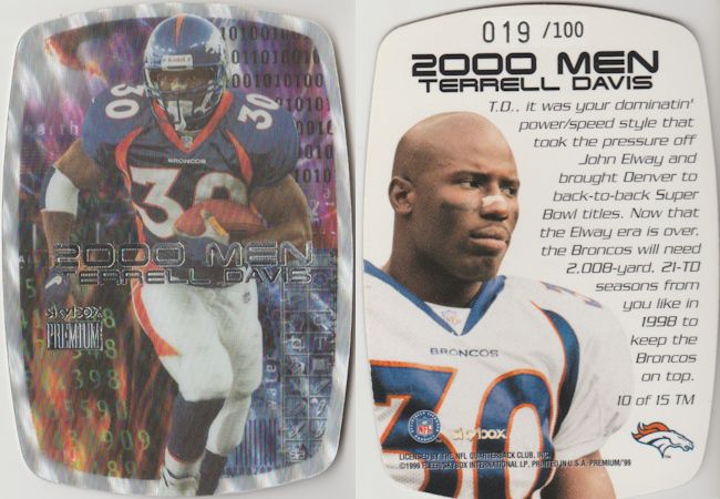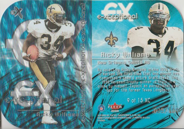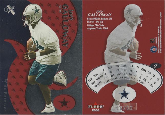 ![]() 1999 Absolute Peyton Manning 24/200 ![]() 2000 Fleer Ex Ricky Williams 005/100 ![]() 2000 EX Essential Credentials Now Joey Galloway 09/50 ![]() 1999 EX Essential Credentials Future Amos Zereoue 22/29 |