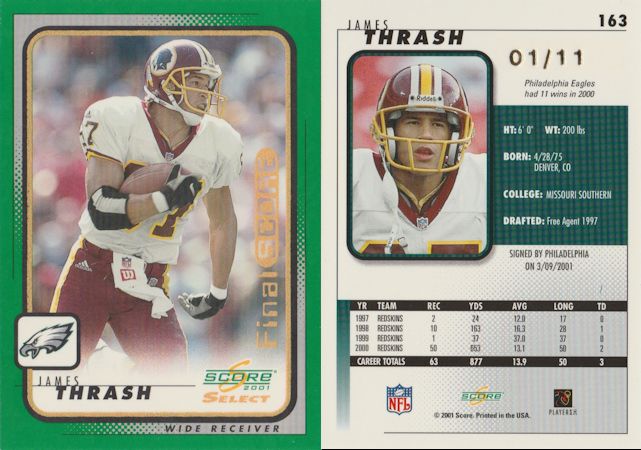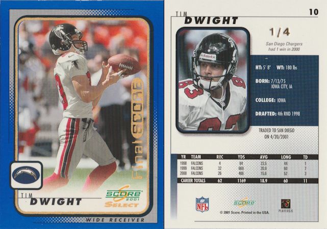 ![]() 2000 Finest Marino auto and 2001 Donruss Classics Tony Boselli Inaugural Year Patch ![]() 2001 SP Game Used Edition - LaDainian Tomlinson TCU college jersey ![]() Buy Back auto from 2001 Honors 01/02 ![]() 2001 Score Select Final Score Tim Dwight 1/4 These were supposed to be numbered to their team's wins that year, which was 1, so I'm not sure why it's numbered to 4. ![]() 2001 Score Select Final Score James Thrash 01/11 |