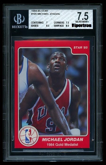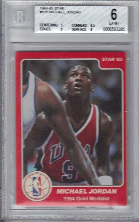 1984 85 Star Basketball Michael Jordan Rookie RC 101 BGS 8 NM MT High Subs | eBay This is a 101 that appears to be sheet cut as there was another with the red bleed, this one has white in the surface and a large scratch (if you saw this card in person, the cutting of the edges will not resemble other 101's cut by Star): 1984-85 star #101 Michael Jordan rc bvg 9.5 centering Impossible MJ trc |