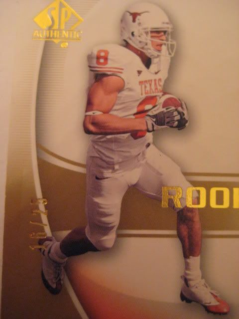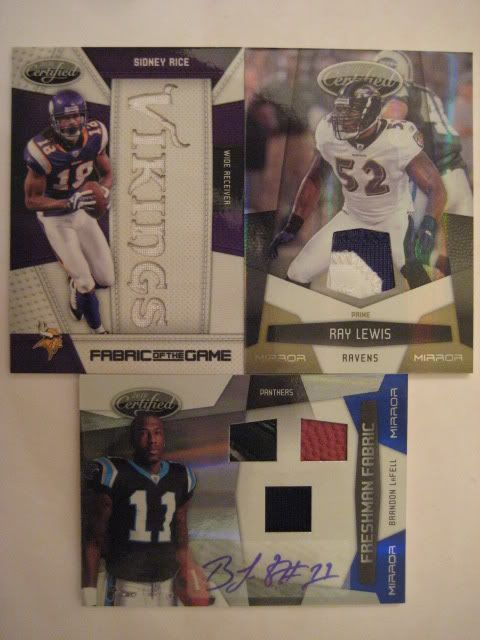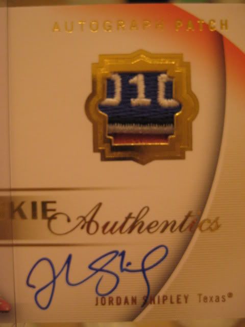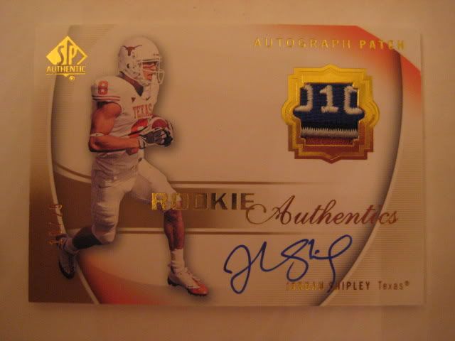S. Rice "Vikings" 7 piece jersey /25, R. Lewis 2-color patch /50, B. LaFell shoe/football/jersey auto RC /50 ![]() A very solid box of Certified. I only bought packs too and got the three best hits because another guy bought the last remaining packs and pulled the fourth hit, a Dan LeFevour RC auto. And then the best hit tonight for me... . . . . . . . . . . . . . . . . . . . . Jordan Shipley SPA Gold RC 5-color patch auto 16/25!!! ![]() ![]() ![]() ![]() I haven't seen too many nice patch cards out of SPA until this one!!! Cards will be available for sale soon! SORRY, I DON'T TRADE SO DON'T WASTE MY TIME...