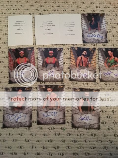![]() Alexa Bliss Silver Redemption, Alexa Bliss Bronze Redemption, Alexa Bliss Redemption, Billie Kay 57/99 Angelo Dawkins 1/1, Angelo Dawkins 24/99, Andrade "Cien" Almas 10/10, Peyton Royce 76/99 Buddy Murphy 19/99, Tye Dillinger 68/99, Austin Aries 05/99 |