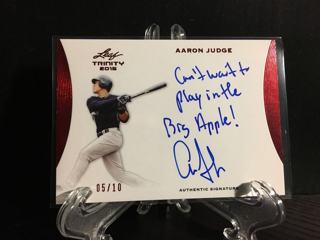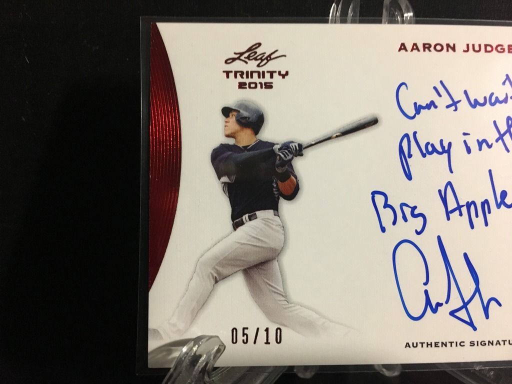 Hey guys - looking to make some extra cash for the family so I am looking to sell this awesome Aaron Judge card of mine: 2015 Leaf Trinity Red Inscriptions Auto #05/10. The kid is on some tear and doesnt look to slow down! It is currently on eBay for a buy-it-now price of $600 with a few watchers. Last one I saw was listed for buy-it-now at $700 and sold with a best offer of $500. I'm looking at the $500 ballpark DLVD as well. I really just want this to end up in a nice collectors home at the end of the day as it's straight from my own PC and has been well taken care of. It will be shipped and delivered well packaged in a top loader, packing, and bubble envelope. In hindsight I probably should have started here first and given you guys the first crack - but it's still available!