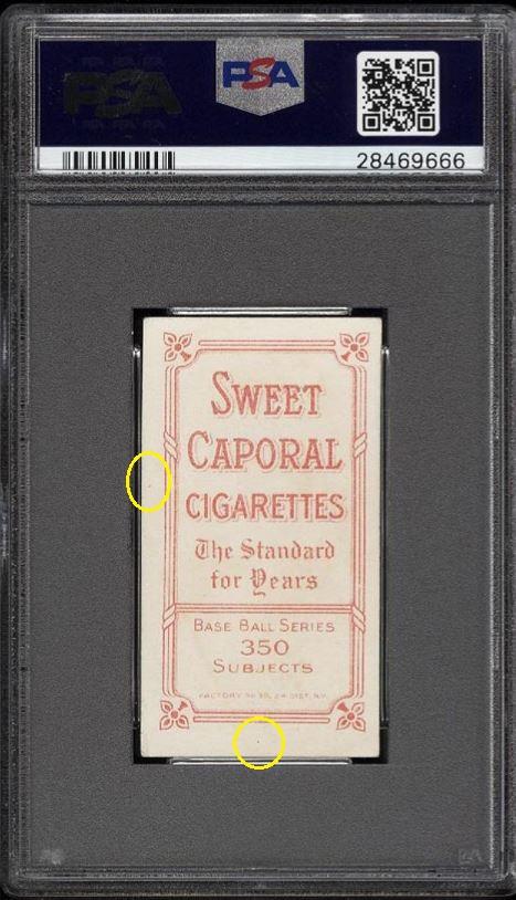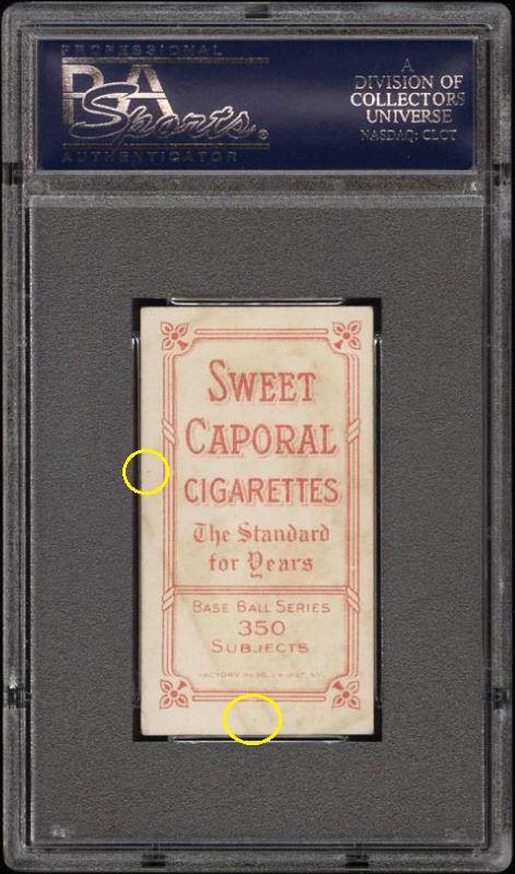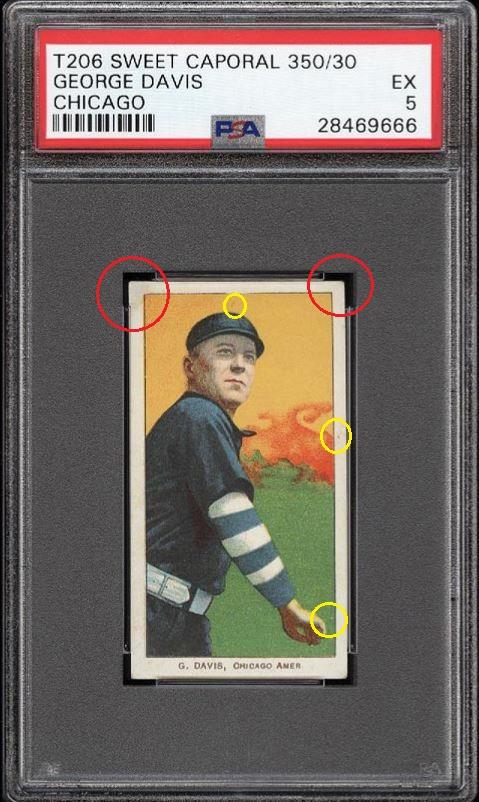 1909-11 T206 George Davis CHICAGO - Sweet Caporal Value gain of $253.62 This card was sold by PWCC to whitman111 (Gary Moser) as a PSA-2 on October 11, 2016 for $114.38. PWCC Marketplace link: https://www.pwccmarketplace.com/items/1360933 Same card was sold by PWCC as a PSA-5 for $368.00 on February 05, 2018. PWCC Marketplace link: https://www.pwccmarketplace.com/items/1599942 Same card sold again by seller caldango for $621.00 on December 09, 2018. PSA Registry link: https://www.psacard.com/cert/28469666/ Yellow circles are fiber or print mark identifiers. Red circles show corner repair. Back of card has been cleaned. Spots to the right of the face were removed. Any other surface issues that may have been addressed can't be seen. ![]() ![]() ![]()