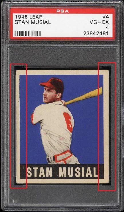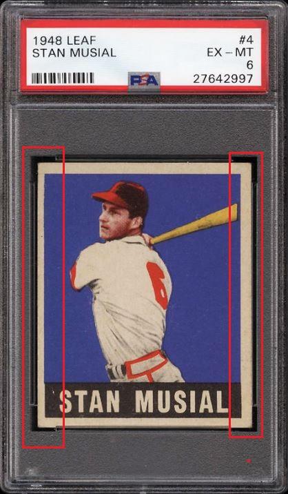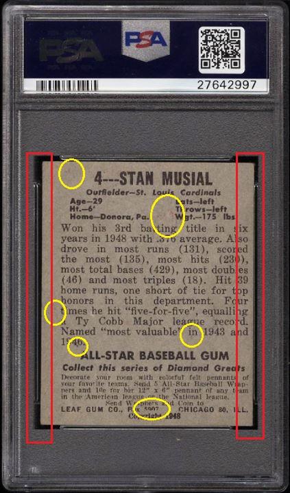 1948 Leaf Stan Musial RC #4 Value gain of $1,624.00 This card was purchased by whitman111 (Gary Moser) from PWCC (Brent and Betsy Huigens) as a PSA-4 on June 22, 2017 for $777.00. PWCC Marketplace link: https://www.pwccmarketplace.com/items/1508612 Same card was sold by PWCC (Brent and Betsy Huigens) as a PSA-6 for $2,401.00 on December 10, 2017. PWCC Marketplace link: https://www.pwccmarketplace.com/items/1598452 Yellow circles are print or fiber identifiers. Red squares identify trimmed left and right edges. ![]() ![]() ![]()