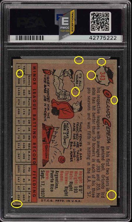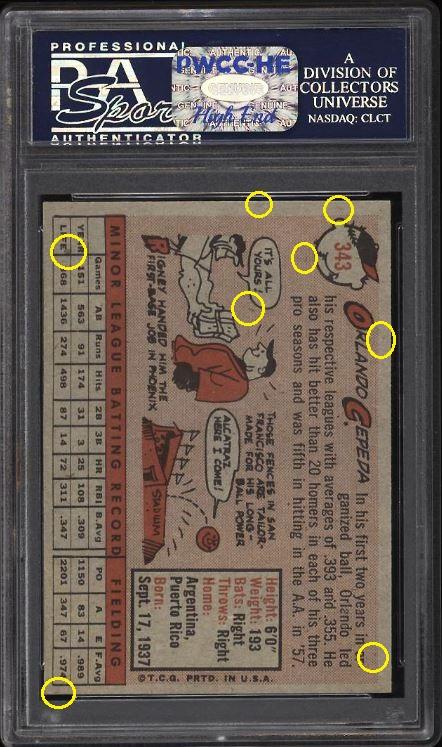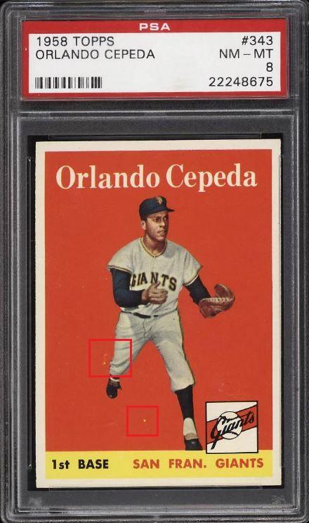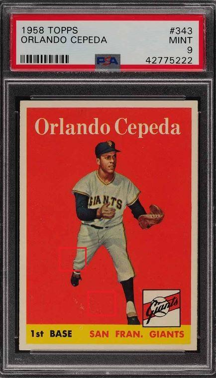 PSA Cert #42775222 1958 Topps Orlando Cepeda RC #343 Value gain of $5,240.00 This card was purchased by whitman111 (Gary Moser) from PWCC (Brent and Betsy Huigens) as a PSA-8 on December 05, 2018 for $860.00. PWCC Marketplace link: https://www.pwccmarketplace.com/items/1882853 Same card was sold by PWCC (Brent and Betsy Huigens) as a PSA-9 for $6,100.00 on May 13, 2019. PWCC Marketplace link: https://www.pwccmarketplace.com/items/1977001 Yellow circles are print or fiber identifiers. Red squares identify color added to red solid. Enlarging the images confirms this. Note that the white spots that show up on the PSA 9 scan are produced by glare from glitches in the plastic holder or on the scanner glass. ![]() ![]() ![]()