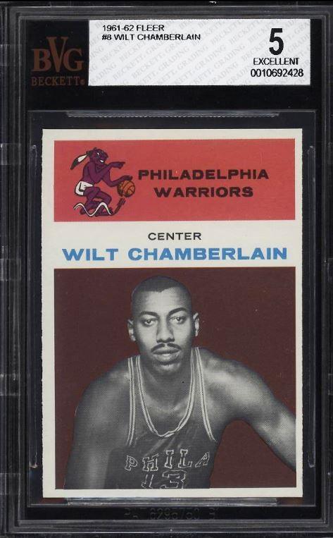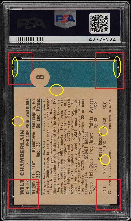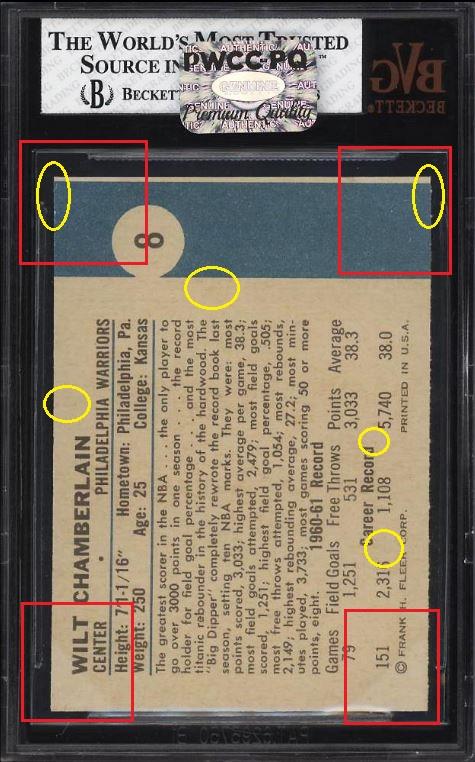 PSA Cert #42775224 1961 Fleer Wilt Chamberlain RC #8 Value gain of $3,156.31 This card was purchased by whitman111 (Gary Moser) from PWCC (Brent and Betsy Huigens) as a BVG-5 on December 10, 2018 for $1,594.69. PWCC Marketplace link: https://www.pwccmarketplace.com/items/1870252 Same card was sold by PWCC (Brent and Betsy Huigens) as a PSA-7 for $4,751.00 on March 20, 2019. PWCC Marketplace link: https://www.pwccmarketplace.com/items/1930426 Yellow circles are print or fiber identifiers. Red squares identify the discoloration due to the card being kept in an album with photo tabs. If you look at the BVG 5 image of the back, you can see the triangular shape of the tabs. In the listing description, Brent Huigens refers to the tabs having left "compression marks", which are not mentioned in the PSA 7 listing. From the BVG-5 listing description: "Harshly graded on account of some very faint impressions left by corner tabs (card was clearly stored in an album at one point)." From the PSA-7 listing description: "This card appears as if it was just plucked from a wax pack with uncirculated qualities throughout." - No mention of the tab marks that he clearly saw 3 months earlier... ![]() ![]() ![]()