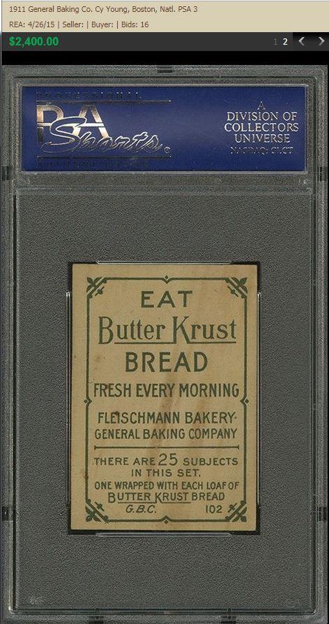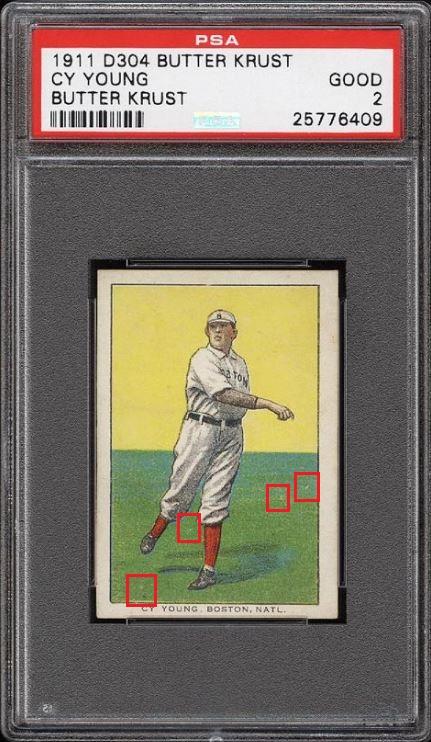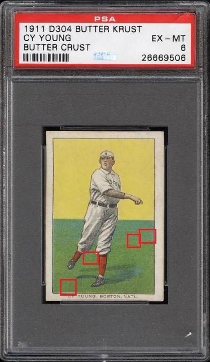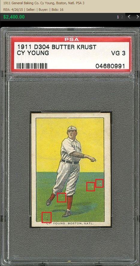 This card was initially purchased by an unknown buyer on April 26, 2015 from Robert Edwards Auctions (REA). The card was a PSA-3 at that time and the purchase price was $2,400.00. Below is the card from that auction: (Purchase info from VCP is at the top of each image) NOTE: Red squares identify areas where color was added to the front after the second purchase. PSA Cert #04680991 ![]() ![]() The next time the card reappears, it has been altered and resubmitted to PSA and is given a grade of PSA-2. It is then listed with a PWCC-HE sticker and sold by PWCC (Brent and Betsy Huigens) to an unknown buyer on July 14, 2016 at a loss of $377.00, selling for $2,023.00. Link: https://www.pwccmarketplace.com/items/1304609 Below is the card from that auction - notice the changes in appearance: PSA Cert #25776409 ![]() ![]() The third time the same card reappears, it has been altered further and resubmitted to PSA and is given a grade of PSA-6. It is then listed and sold by PWCC (Brent and Betsy Huigens) to an unknown buyer on March 12, 2017 with a value gain of $4,178.00, selling for $6,201.00. Link: https://www.pwccmarketplace.com/items/1436131 Below is the card from that auction - notice the further changes in appearance. I used yellow circles to identify dark stains or fibers that remained on the back after both alterations. These same four spots are visible in all three back of card images: PSA Cert #26669506 ![]() ![]() Some questions: 1) Who made the first purchase? 2) Who made the second purchase? The masked buyer ID on VCP has an ID of o***3 3) Were there one or two card doctors? The skill on the second alteration where the color was added and back cleaned up nicer was much more articulate than the first. 4) Who submitted the card that achieved the PSA 6? It appears to be a two card submission with 26669506 being the Cy Young card and 26669507 not receiving a number. ![]()