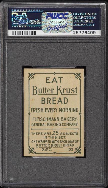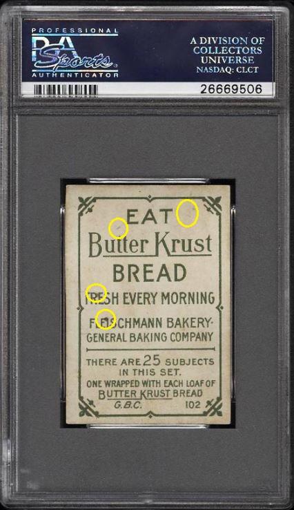 1909 E90-1 American Caramel Fred Clarke Philadelphia SGC 2 to PSA 6 (w/ PWCC-PQ sticker) Alteration types: Chemically brightened (damage caused on reverse by chemical soaking) Sold on 3/23/2018 as a SGC 2 by Mile High Card Co. to an unknown buyer for $514.80 Consigned to PWCC and sold on 10/14/2018 as a PSA 6 for $1,501.66 Final price: $1,501.66 Value gain: $986.86 This card was possibly undergraded by SGC to begin with, as noted in the Mile High description of the SGC 2: "There is a very slight wave in the paper stock on the reverse in the upper left quadrant that could possibly be taken as a wrinkle, but even so, this seems like a very harsh technical assessment." However, the buyer of this card decided to give it a chemical bath, as the light toning on the back has turned to a brighter white. Most curiously, the chemicals did some damage to the print on the back around the knob of the leftmost bat, highlighted in a blue box. The ink ran in this spot after the card was dunked in the solution, as you can see some errant ink to the left of the "B" in the word Base Ball, for example. PSA really blew it on this assessment. Nevertheless, Brent from PWCC awarded it a PWCC-PQ sticker. Does he personally know the person who consigned it? SGC 2: http://www.milehighcardco.com/1909_1...-LOT54349.aspx PSA 6: https://www.pwccmarketplace.com/items/1805358 ![]()