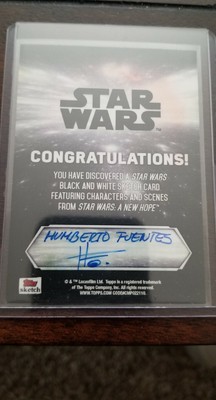 Hopefully, they have answered your questions. Here is my contribution. what are they? Miniature art. Typically, for what you possess, a sketch card is an original, one of a kind, piece of art created by an approved artist who has been selected by the licensed card company. The sketch card sizes vary; the most common sketch card size is (approximately) 2.5inches by 3.5inches. Are they rare? Yes. They are not mass produced cards. Each sketch card is an original piece of art by the artist. Because each sketch card is an original, the term "one-of-one" or "1/1" is often utilized. Are they valuable? Yes and no. The question is subjective to each individual (whether buyer or seller). Ultimately, it will be the buyer who decides what they are willing to pay to have that sketch card. Is the artist popular amongst collectors? Will the sketch card create a buying frenzy amongst collectors? Is a Star Wars sketch card valuable at a place that is selling sports memorabilia? If you are a hardcore fan of Star Trek memorabilia and you think Star Wars sucks, will you consider the Star Wars sketch card valuable? Are they just another insert? Yes. Below are the only (4) Star Wars sketch cards (by the artist you have) that have sold, as of the date & time of my posting, in eBay's "Sold Items". Note that each character is well established and popular among Star Wars fans. The characters are Boba Fett, Princess Leia & R2-D2, Chewbacca, and Luke Skywalker (Jedi Master). Topps Star Wars 2017 Masterwork WOOD Sketch Card BOBA FETT HUMBERTO FUENTES 1/1 eBay item number: 372685084676 Ended: Jun 13, 2019 , 8:25PM Winning bid: US $161.19 ![]() ![]() Topps Star Wars black and white sketch card signed by Humberto Fuentes eBay item number: 113787401485 Ended: Jun 24, 2019 , 8:17AM Winning bid: US $19.99 ![]() ![]() ![]() TOPPS STAR WARS SOLO A STAR WARS STORY SKETCH CARD HUMBERTO FUENTES 1/1 eBay item number: 323853051186 Ended: Jul 12, 2019 , 1:22PM Winning bid: US $26.25 ![]() Luke Skywalker Topps Star Wars Masterwork Sketch Card 1/1 Humberto Fuentes eBay item number: 333268978821 Ended: Jul 21, 2019 , 10:54AM Winning bid: US $11.50 ![]()
