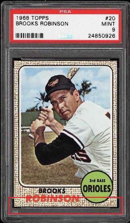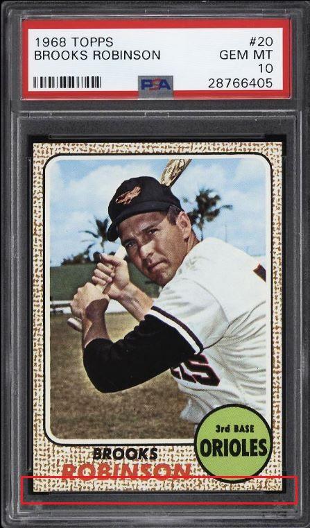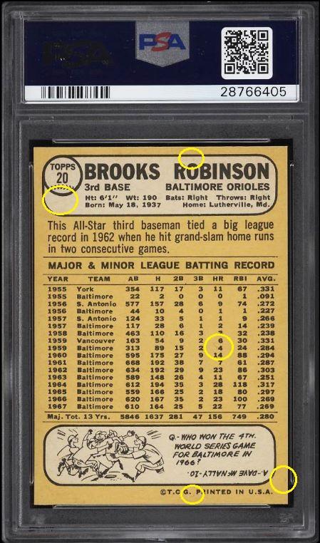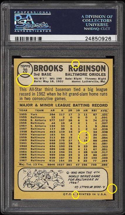 1968 Topps Brooks Robinson #20 Value gain of $685.50 This card was purchased by Ebay ID card-buyer from PWCC (Brent and Betsy Huigens) as a PSA 9 for $113.50 on August 14, 2017. PWCC Marketplace link: https://www.pwccmarketplace.com/items/1529377 Same card was sold by PWCC (Brent and Betsy Huigens) as a PSA 10 for $799.00 on June 14, 2018. PWCC Marketplace link: https://www.pwccmarketplace.com/items/1672279 Yellow circles are print, fiber, or chipping identifiers. Red box identifies trimmed bottom edge. ![]() ![]() ![]() ![]() ![]()