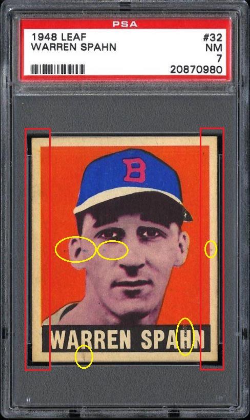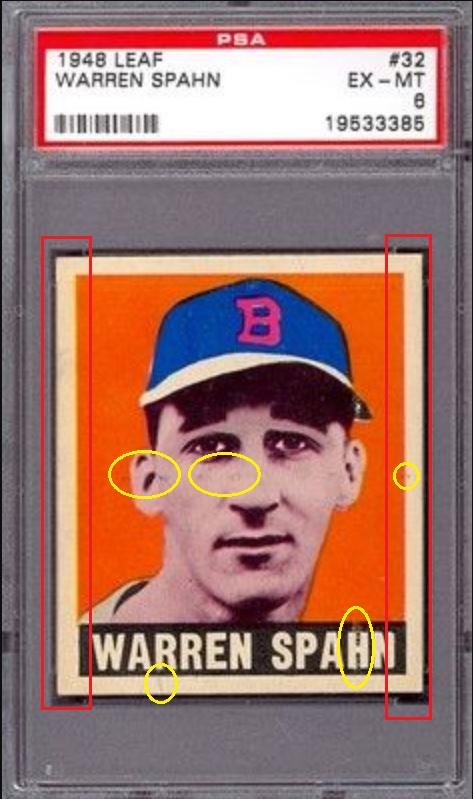 PSA Cert #20870980 1948 Leaf Warren Spahn #32 Value gain of $591.23 This cert is currently in Set Registry inventory and is featured in one or more sets, including Portland Leaf. This card was purchased by whitman111 (Gary Moser) from Ebay seller just_collect as a PSA 6 for $432.00 on June 17, 2012. VCP link: https://vintagecardprices.com/card/b...=&limit=999999 Same card was sold by PWCC as a PSA 7 for $1,023.23 on February 05, 2013. PWCC Marketplace link: https://www.pwccmarketplace.com/items/340374 Yellow circles are print, fiber, or chipping identifiers. Red boxes identify trimmed left and right edges. No back image provided. ![]()