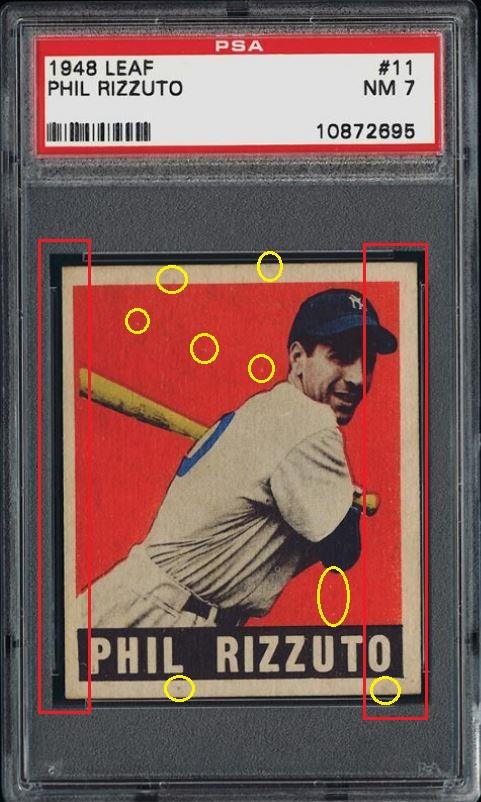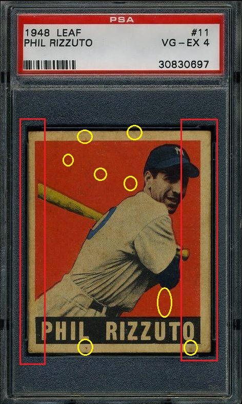 PSA Cert #10872695 1948 Leaf Phil Rizzuto #11 Value gain of $398.01 Set Registry: none This card was purchased by whitman111 (Gary Moser) from Ebay seller rockbottomsports as a PSA 4 for $86.55 on November 20, 2007. VCP link: https://vintagecardprices.com/card/b...=&limit=999999 Same card was sold by PWCC as a PSA 7 for $484.56 on April 05, 2011. PWCC Marketplace link: https://www.pwccmarketplace.com/items/78026 Yellow circles are print, fiber, or chipping identifiers. Red boxes identify trimmed left and right edges. Obviously cleaned with an unknown substance. No back image provided. ![]()