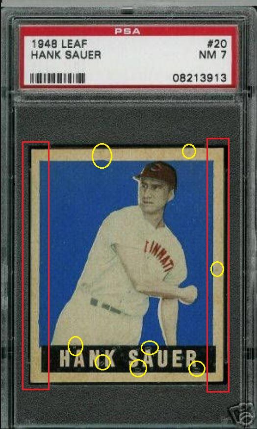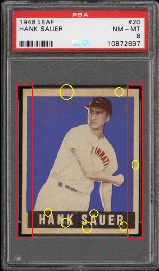 PSA Cert #10872697 1948 Leaf Hank Sauer #20 (short print) - Pop 1 of 6 Value gain of $1,199.00 This cert is currently in Set Registry inventory and is featured in one or more sets, including cardyman. This card was purchased by whitman111 (Gary Moser) from Ebay seller yorktownsc as a PSA 7 for $1,126.00 on October 08, 2007. VCP link: https://vintagecardprices.com/card/b...20/42407/PSA/7 Same card was sold by PWCC as a PSA 8 for $2,325.00 on September 07, 2016. PWCC Marketplace link: https://www.pwccmarketplace.com/items/1341221 Yellow circles are print, fiber, or chipping identifiers. Red boxes identify trimmed left and right edges. Cleaned with an unknown substance. No back image provided. ![]()