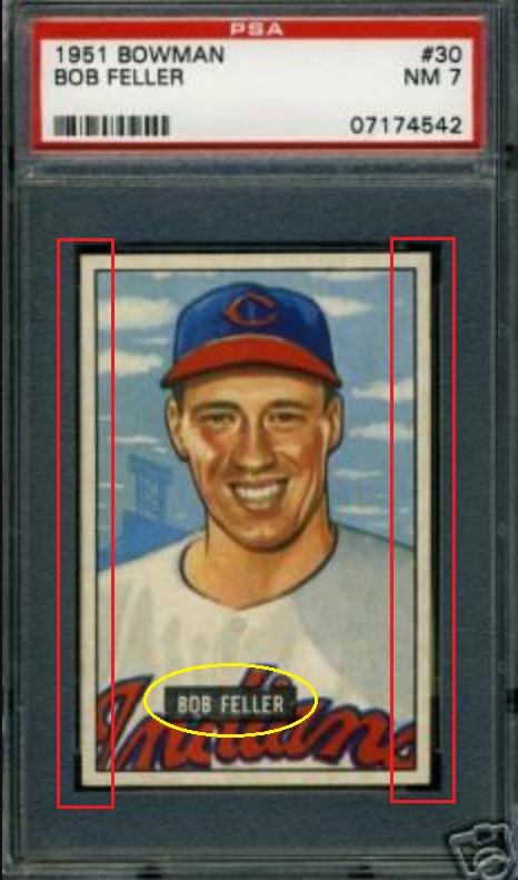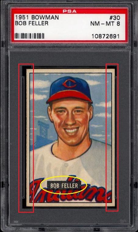 PSA Cert #10872691 1951 Bowman Bob Feller #30 Value gain of $1,199.00 This cert is currently in Set Registry inventory and is featured in one or more sets, including Stan's 1951 Bowman Set. This card was purchased by whitman111 (Gary Moser) from Ebay seller bucks1996 as a PSA 7 for $176.38 on December 06, 2007. VCP link: https://vintagecardprices.com/card/b...=&limit=999999 Same card was sold by PWCC as a PSA 8 for $364.00 on August 11, 2009. PWCC Marketplace link: https://www.pwccmarketplace.com/items/59513 Yellow circles are print, fiber, or chipping identifiers. Red boxes identify trimmed left and right edges. The print flaw (hickey) patterns in the black name box match. No back image provided. ![]() ![]() ![]()