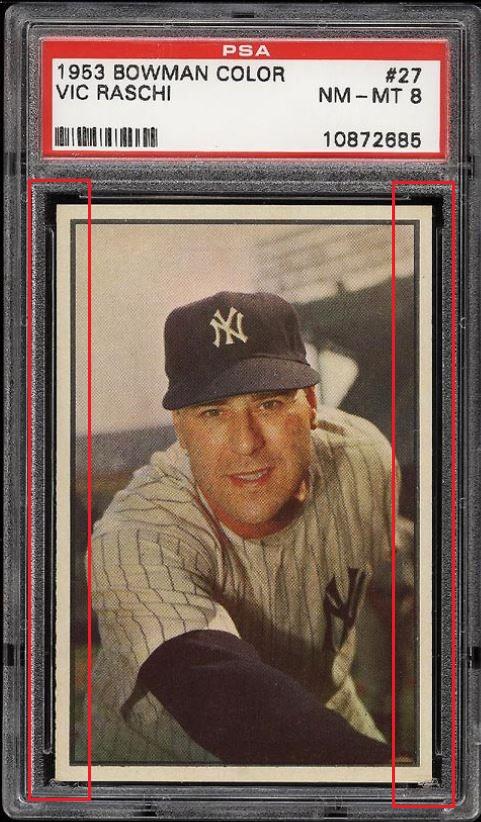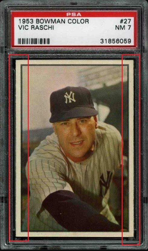 PSA Cert #10872685 1953 Bowman Color Vic Raschi #27 Value gain of $331.09 This cert is currently in Set Registry inventory and is featured in one or more sets, including Capecards. This card was purchased by whitman111 (Gary Moser) from Ebay seller champsandbums as a PSA 7 for $116.91 on December 06, 2007. VCP link: https://vintagecardprices.com/card/b...=&limit=999999 Same card was sold by PWCC as a PSA 8 for $448.00 on June 07, 2017. PWCC Marketplace link: https://www.pwccmarketplace.com/items/1509927 Yellow circles are print, fiber, or chipping identifiers. Red boxes identify trimmed left and right edges. No back image provided. ![]() ![]() ![]()