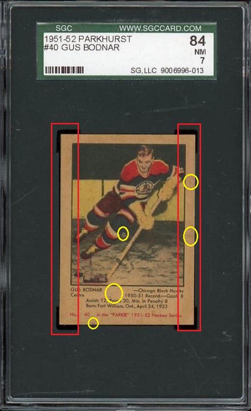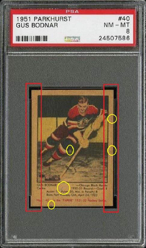 PSA Cert #24507586 1951 Parkhurst Gus Bodnar #40 Value gain of $152.50 This cert is currently in Set Registry inventory and is featured in one or more sets, including Dan's 51 Parkies. This card was purchased by whitman111 (Gary Moser) from Ebay seller davidbvintage as a SGC 7 for $77.00 on June 14, 2015. VCP link: https://vintagecardprices.com/card/h...0/75375/SGC/84 Same card was sold by PWCC as a PSA 8 for $229.50 on October 19, 2015. PWCC Marketplace link: https://www.pwccmarketplace.com/items/1178047 Yellow circles are print, fiber, or chipping identifiers. Red boxes identify trimmed left and right edges. No back image provided. ![]()