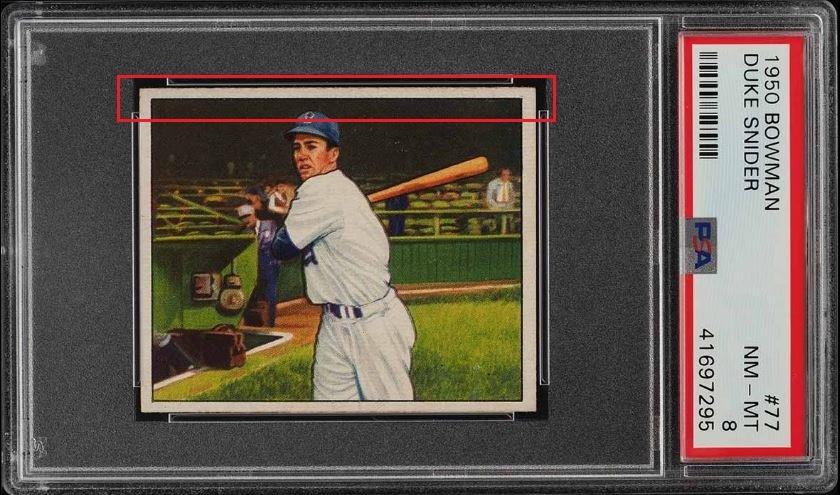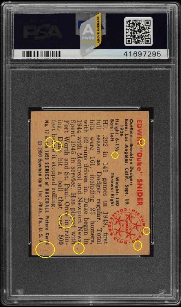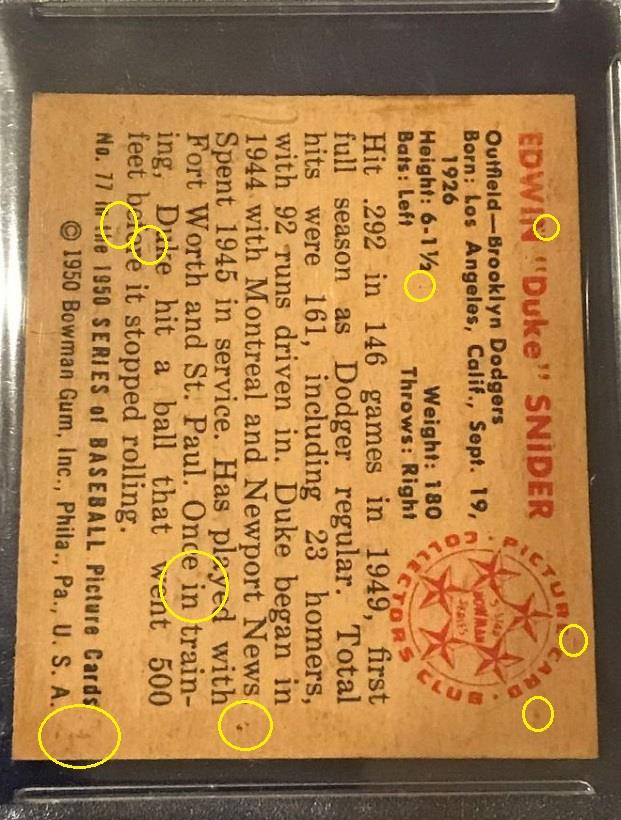 PSA Cert #41697295 1950 Bowman Duke Snider #77 Value gain of $621.12 Set Registry: none This card was purchased by whitman111 (Gary Moser) from Ebay seller rcharrod as a PSA 7 for $268.88 on August 19, 2018. VCP link: https://vintagecardprices.com/card/b...77/70185/PSA/7 Same card was sold by PWCC as a PSA 8 for $1,848.00 on November 08, 2018. PWCC Marketplace link: https://www.pwccmarketplace.com/items/1863985 Same card was sold again by PWCC for $890.00 on August 26, 2019. PWCC Marketplace link: https://www.pwccmarketplace.com/items/2070797 Yellow circles are print, fiber, or chipping identifiers. Red box identifies trimmed top edge. Some of the stain has been removed from the back. Back image provided in first sale data was cropped by the seller. ![]() ![]() ![]()