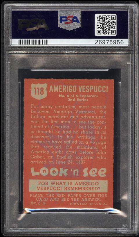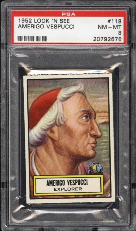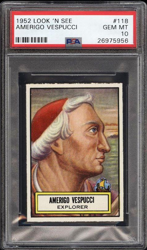 PSA Cert #26975956 PSA Set Registry: private 1952 Topps Look 'N See Amerigo Vespucci #118 - Population 1 of 1 Value gain of $6,554.00 This card was purchased by masked VCP ID m***h (Johnny Adams, Jr.) from Ebay seller PWCC as a PSA 8 for $46.00 on October 30, 2016. PWCC link: https://www.pwccmarketplace.com/items/1374688 Same card was sold by PWCC as a PSA 10 for $6,600.00 on December 20, 2017. PWCC link: https://www.pwccmarketplace.com/items/1596506 Yellow circles are print, fiber, or chipping identifiers. No circled identifiers needed - every chip and border cut matches. No discernable alteration has been noticed. ![]() ![]() ![]()