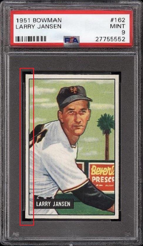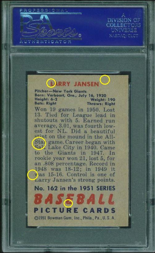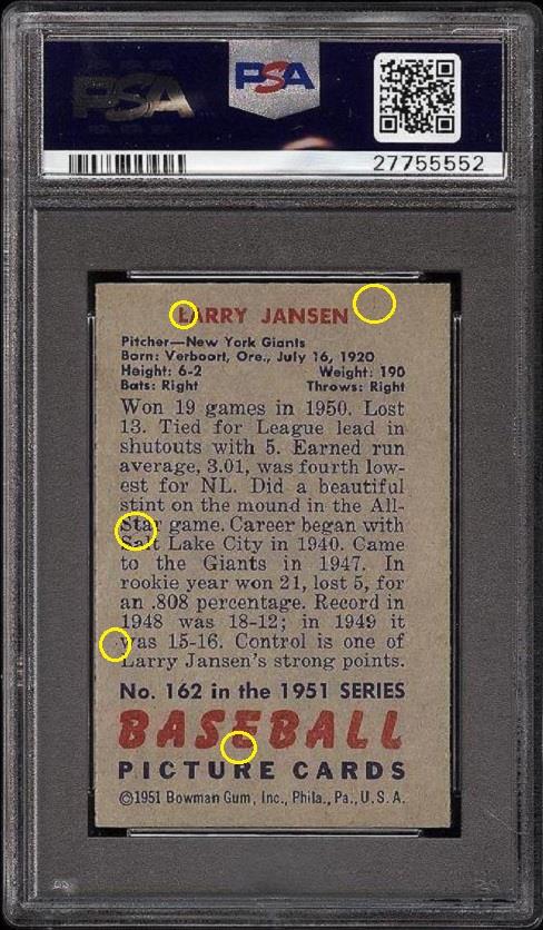 PSA Set Registry: Vintage Corvette - 1951 Bowman 1951 Bowman Larry Jansen #162 Value gain of $437.17 This card was purchased by masked VCP ID m***h (Johnny Adams, Jr.) from Ebay seller www,stevenovella,com as a PSA 8 for $77.00 on June 14, 2016. VCP link: https://vintagecardprices.com/card/b...62/69815/PSA/8 Same card was sold by PWCC as a PSA 9 for $514.17 on October 09, 2017. PWCC link: https://www.pwccmarketplace.com/items/1556006 Yellow circles are print, fiber, or chipping identifiers. Red box identifies trimmed left edge. ![]() ![]() ![]()