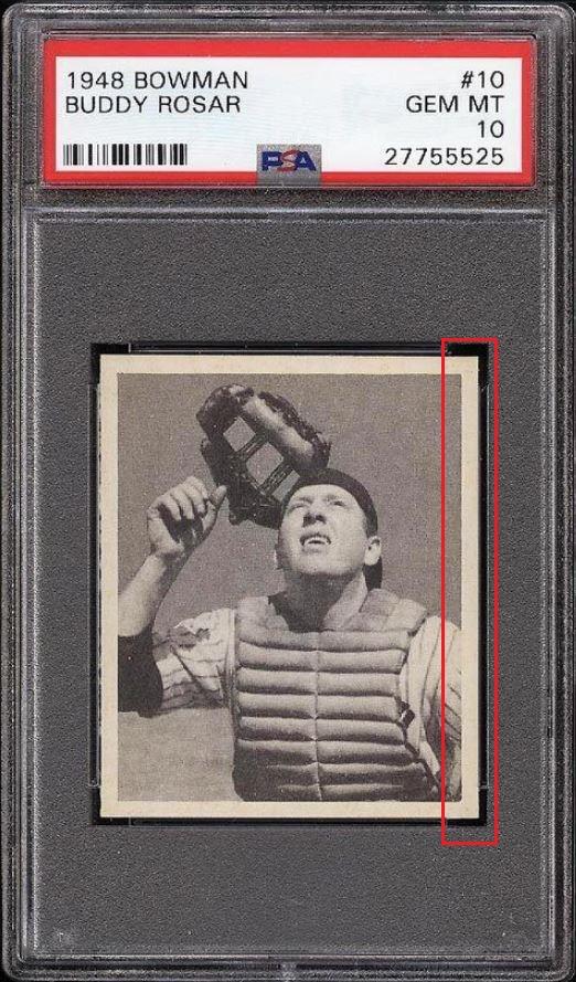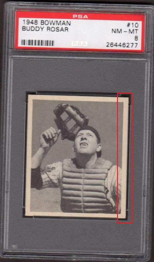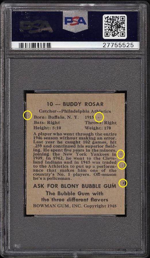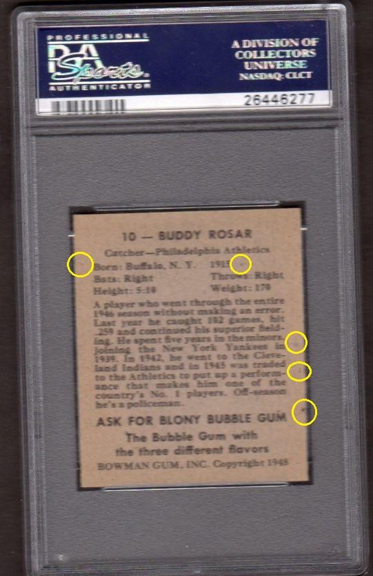 PSA Set Registry: private 1948 Bowman Buddy Rosar #10 - Population 1 of 1 Value gain of $2,835.83 This card was purchased by masked VCP ID m***h (Johnny Adams, Jr.) from Ebay seller sport_cards_gems as a PSA 8 for $103.17 on January 03, 2017. VCP link: https://vintagecardprices.com/card/b...10/52491/PSA/8 Same card was sold by PWCC as a PSA 10 for $2,939.00 on October 09, 2017. VCP link: https://vintagecardprices.com/card/b...0/52491/PSA/10 Yellow circles are print, fiber, or chipping identifiers. Red box identifies trimmed right edge. ![]() ![]() ![]()