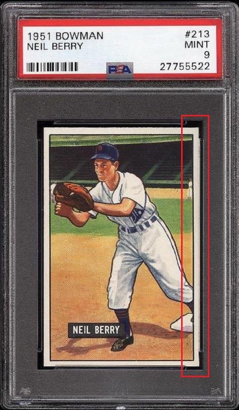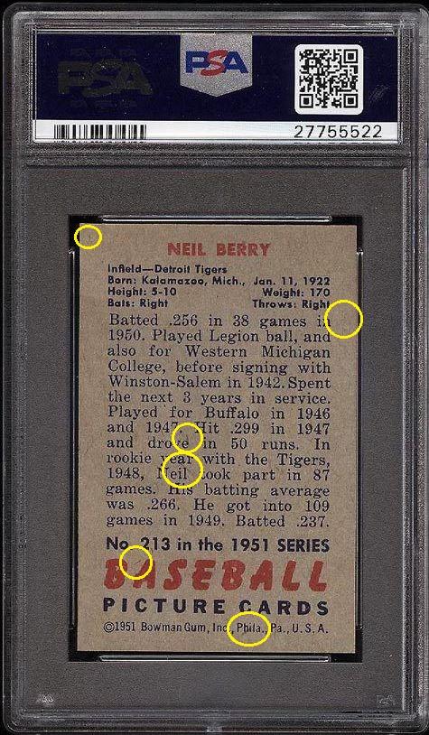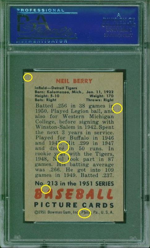PSA Set Registry: CUGoldenBuffalo 1951 Bowman Neil Berry #213 Value gain of $182.23 This card was purchased by masked VCP ID m***h (Johnny Adams, Jr.) from Ebay seller www,stevenovella,com as a PSA 8 for $78.77 on June 14, 2016. VCP link: https://vintagecardprices.com/card/b...13/69761/PSA/8 Same card was sold by PWCC as a PSA 9 for $261.00 on October 09, 2017. VCP link: https://vintagecardprices.com/card/b...13/69761/PSA/9 Yellow circles are print, fiber, or chipping identifiers. Red box identifies trimmed right edge. ![]() ![]() ![]()