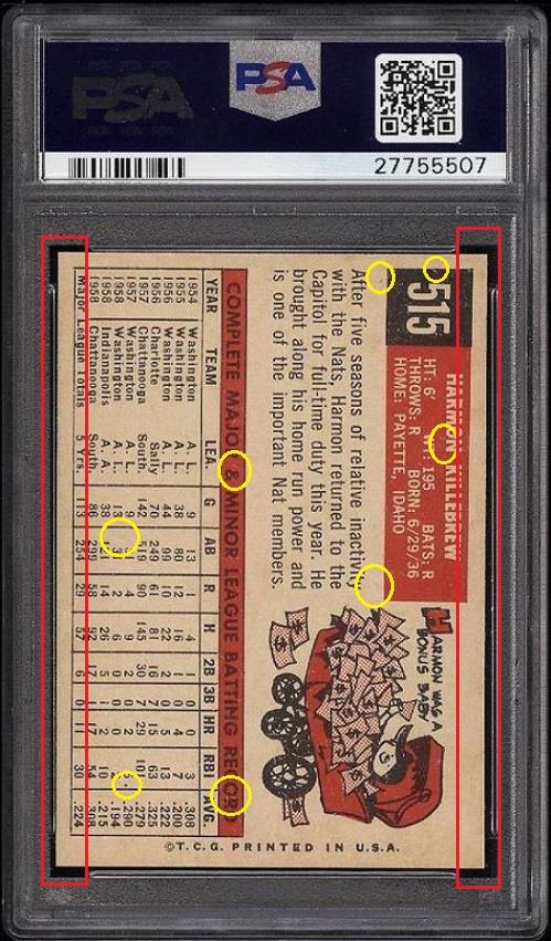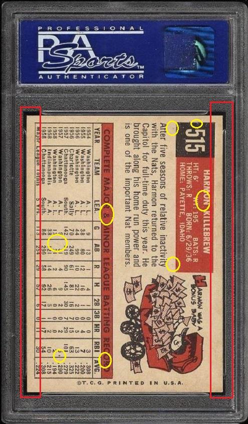 PSA Set Registry: private 1959 Topps Harmon Killebrew #515 Value gain of $2,172.52 This card was purchased by masked VCP ID m***h (Johnny Adams, Jr.) from Ebay seller PWCC as a PSA 8 for $432.98 on March 09, 2016. VCP link: https://vintagecardprices.com/card/b...=&limit=999999 Same card was sold by PWCC as a PSA 9 for $2,605.50 on October 11, 2017. VCP link: https://vintagecardprices.com/card/b...15/64821/PSA/9 Yellow circles are print, fiber, or chipping identifiers. Red boxes identify trimmed left and right edges. ![]() ![]() ![]()